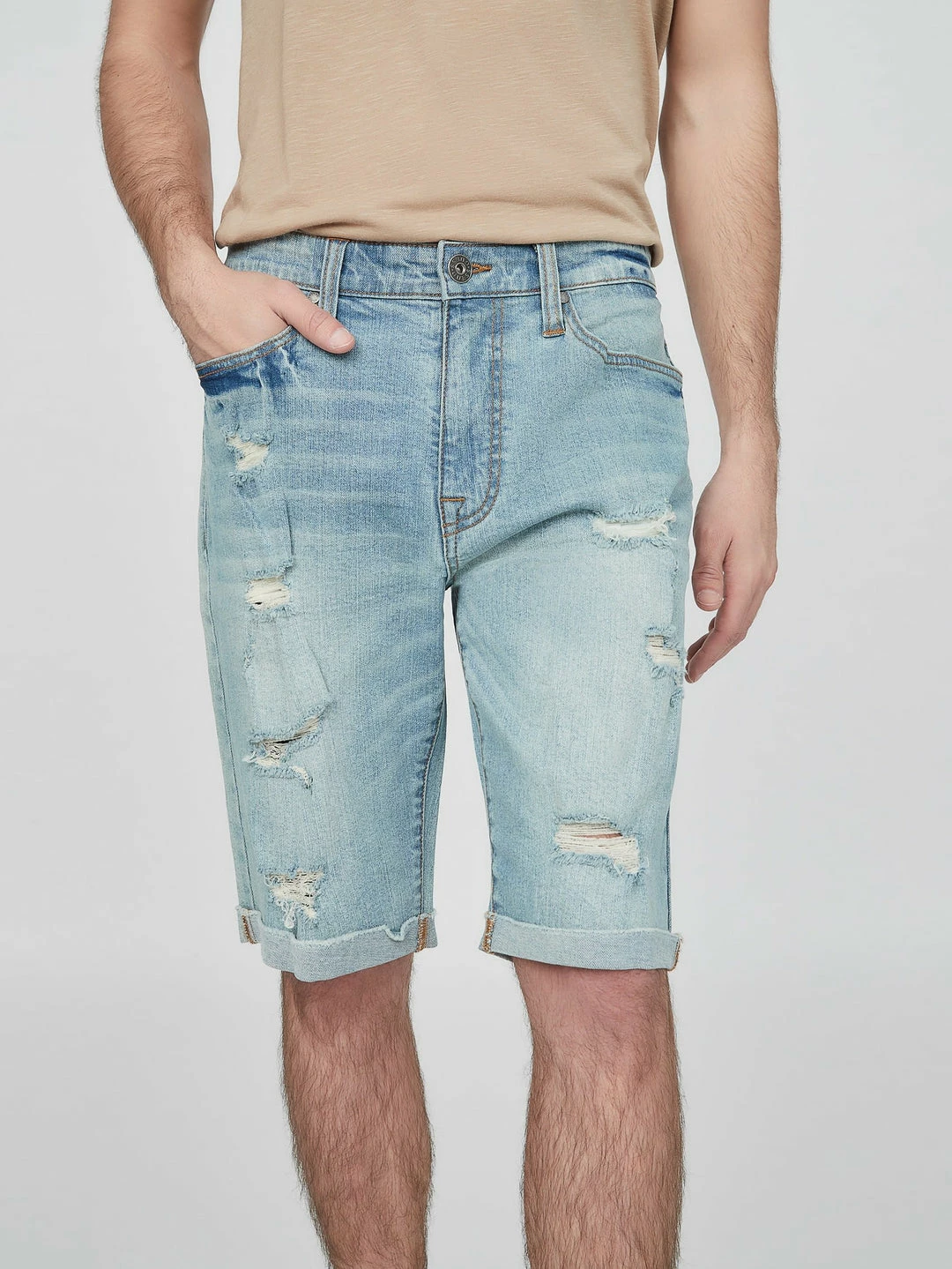 Perfect for warm days, these essential denim shorts in a light wash are designed with a rolled hem and a distressed finish for a casual look.