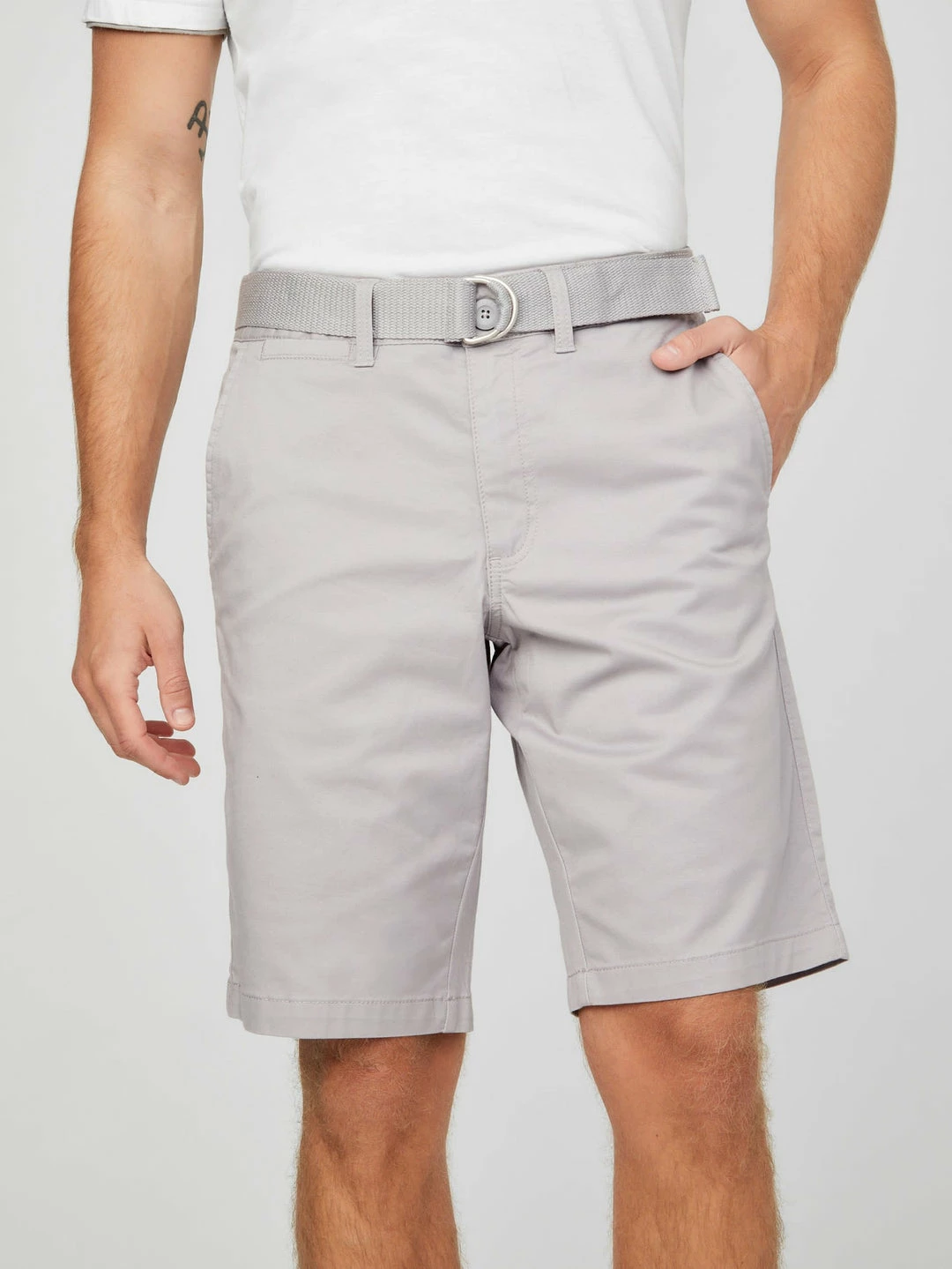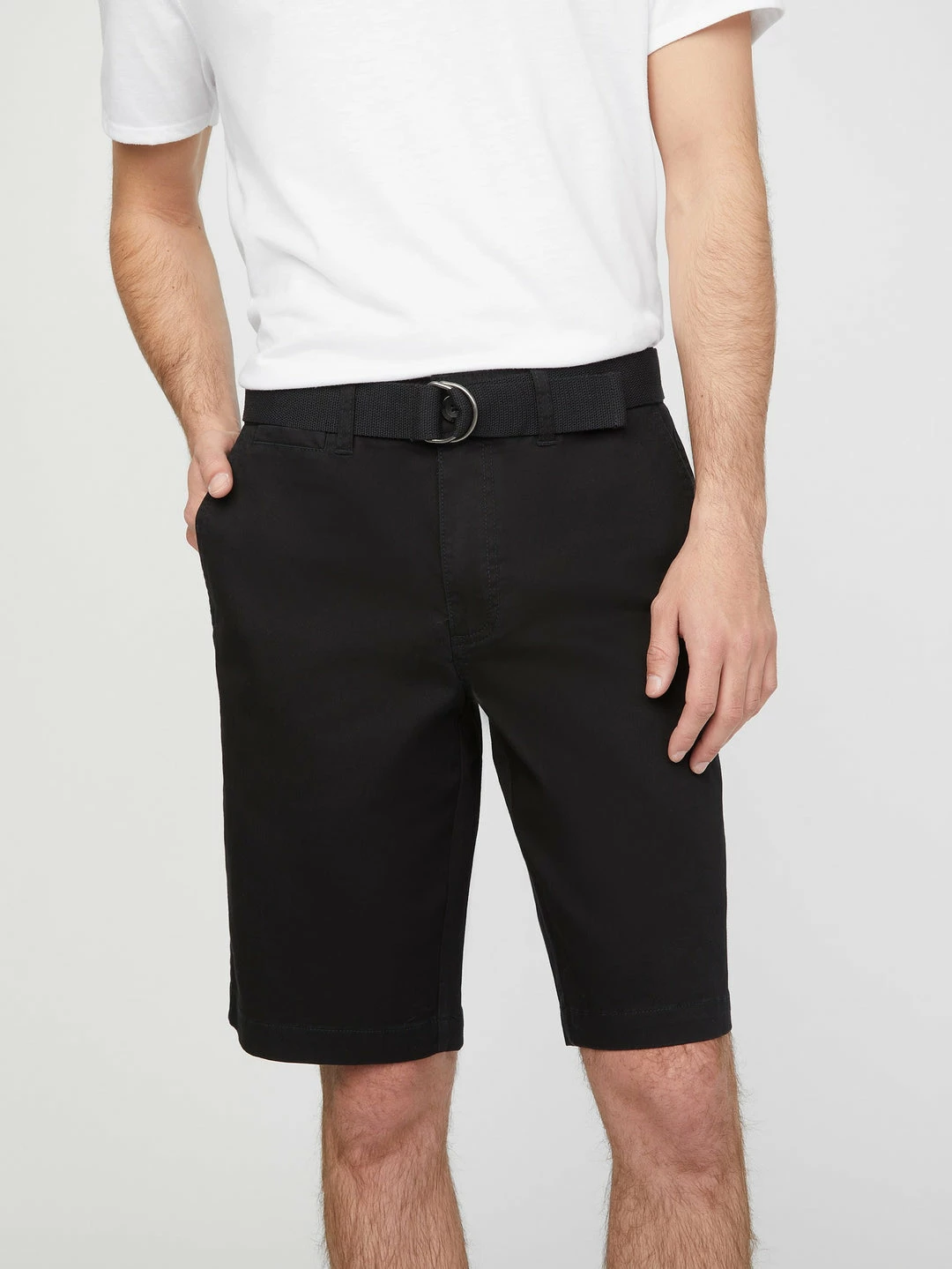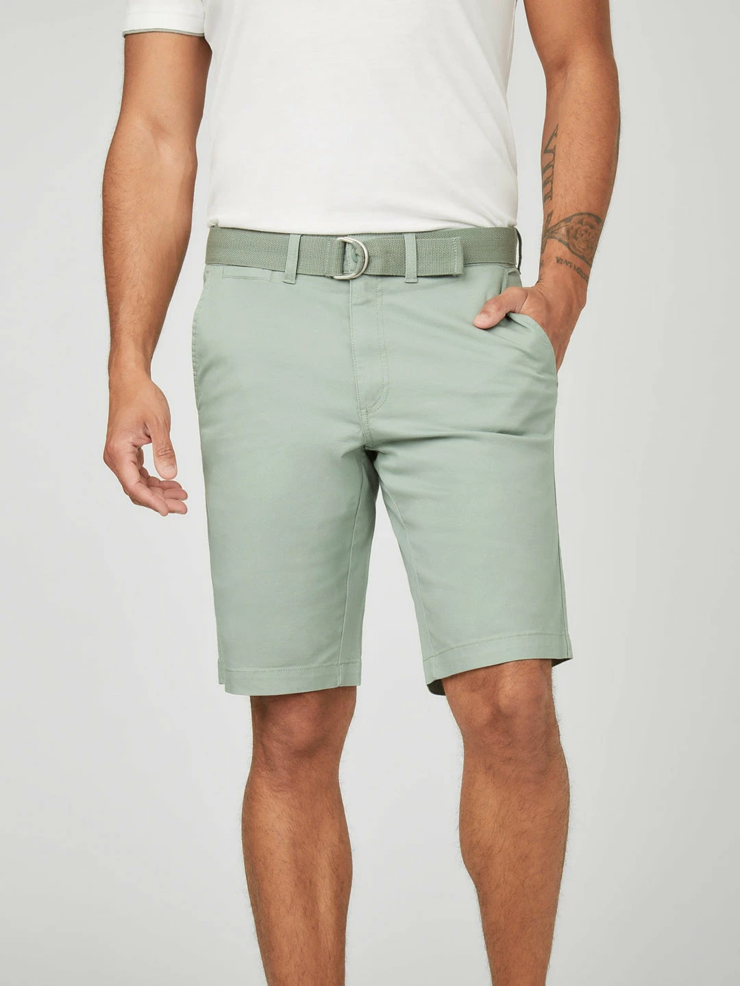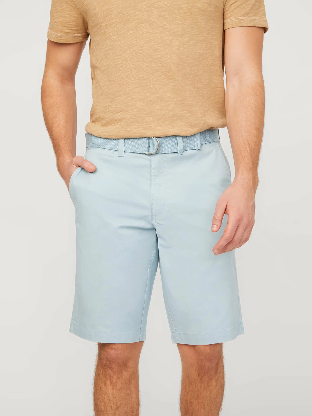A casual classic, this pair of stretch woven shorts features a flat-front design, a D-ring belt, front slip and back welt pockets.