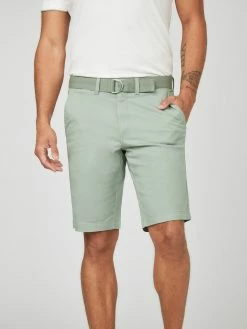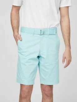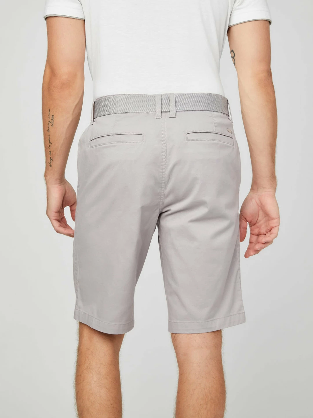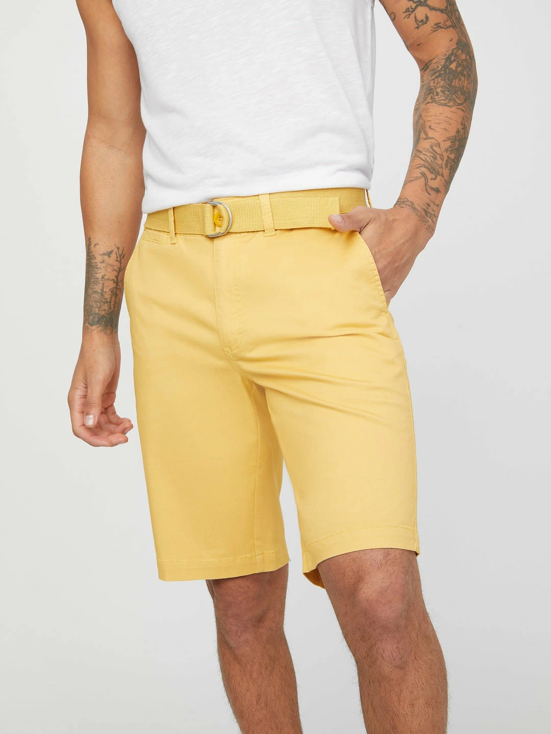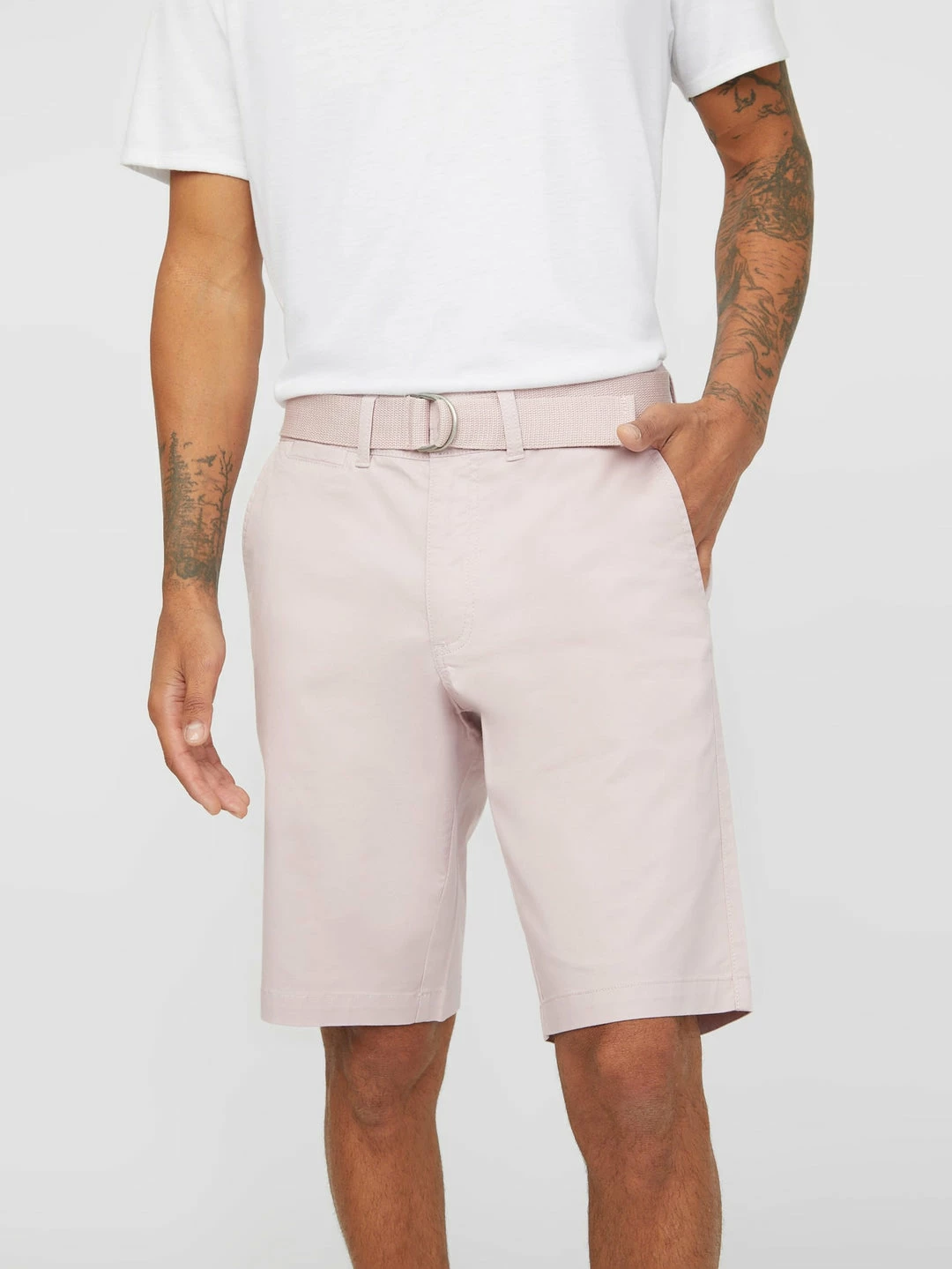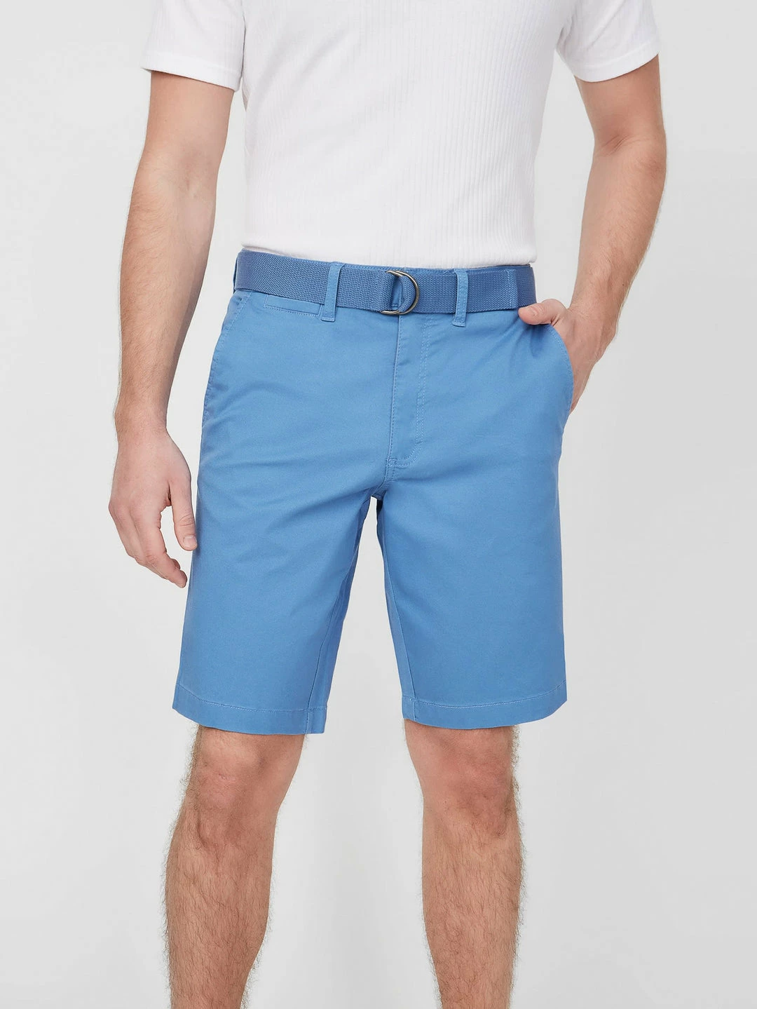 A casual classic, this pair of stretch woven shorts features a flat-front design, a D-ring belt, front slip and back welt pockets.