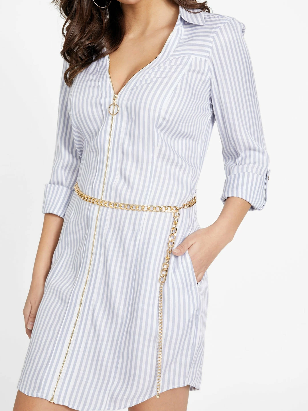 Crafted in a lightweight twill fabrication, this long-sleeve shirtdress features a folded collar with front O-ring zip closure and included chain belt.
