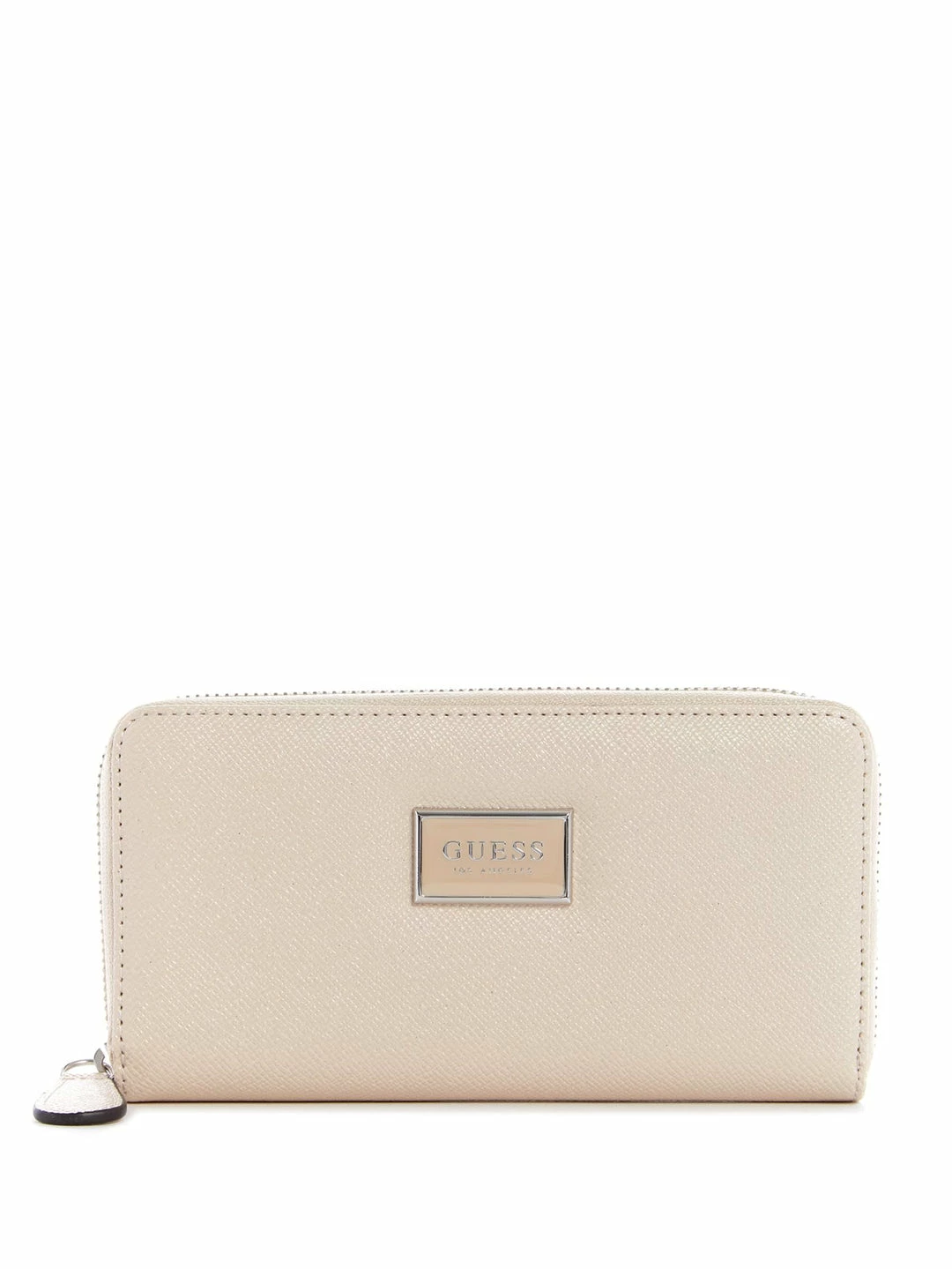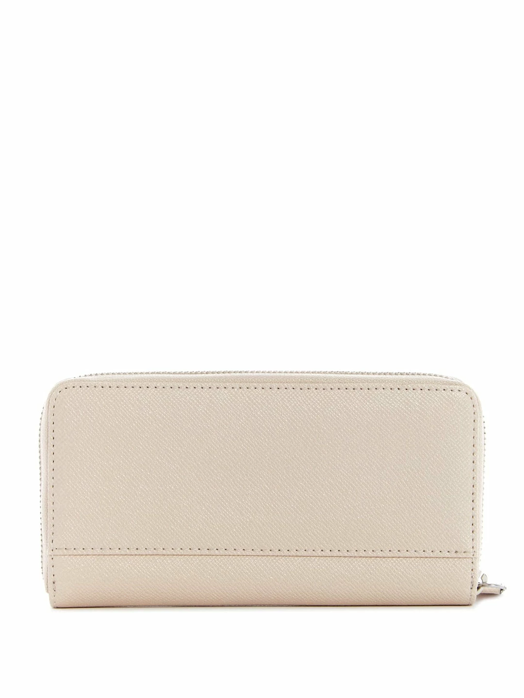 Hold your essentials in style with this glittering faux-leather wallet featuring a zip-around closure and zippered back pocket.