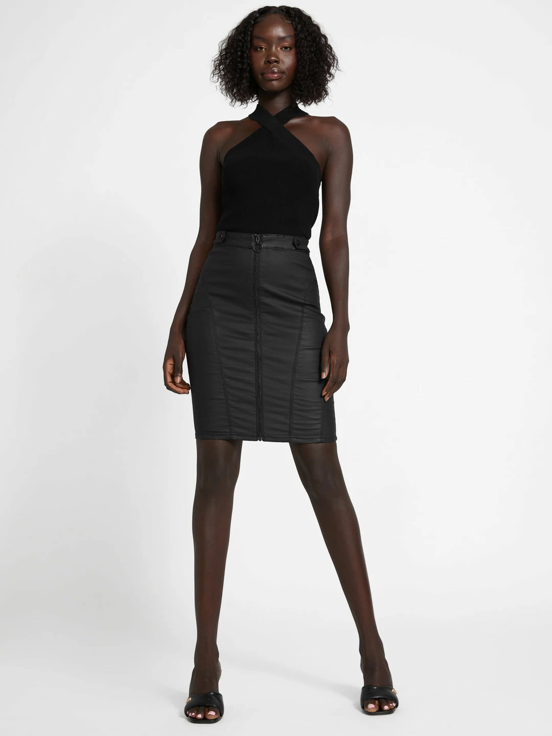 A daring denim must-have. This black-coated skirt features a zip-front closure with O-ring pull, button waist details and stylized seams.