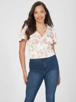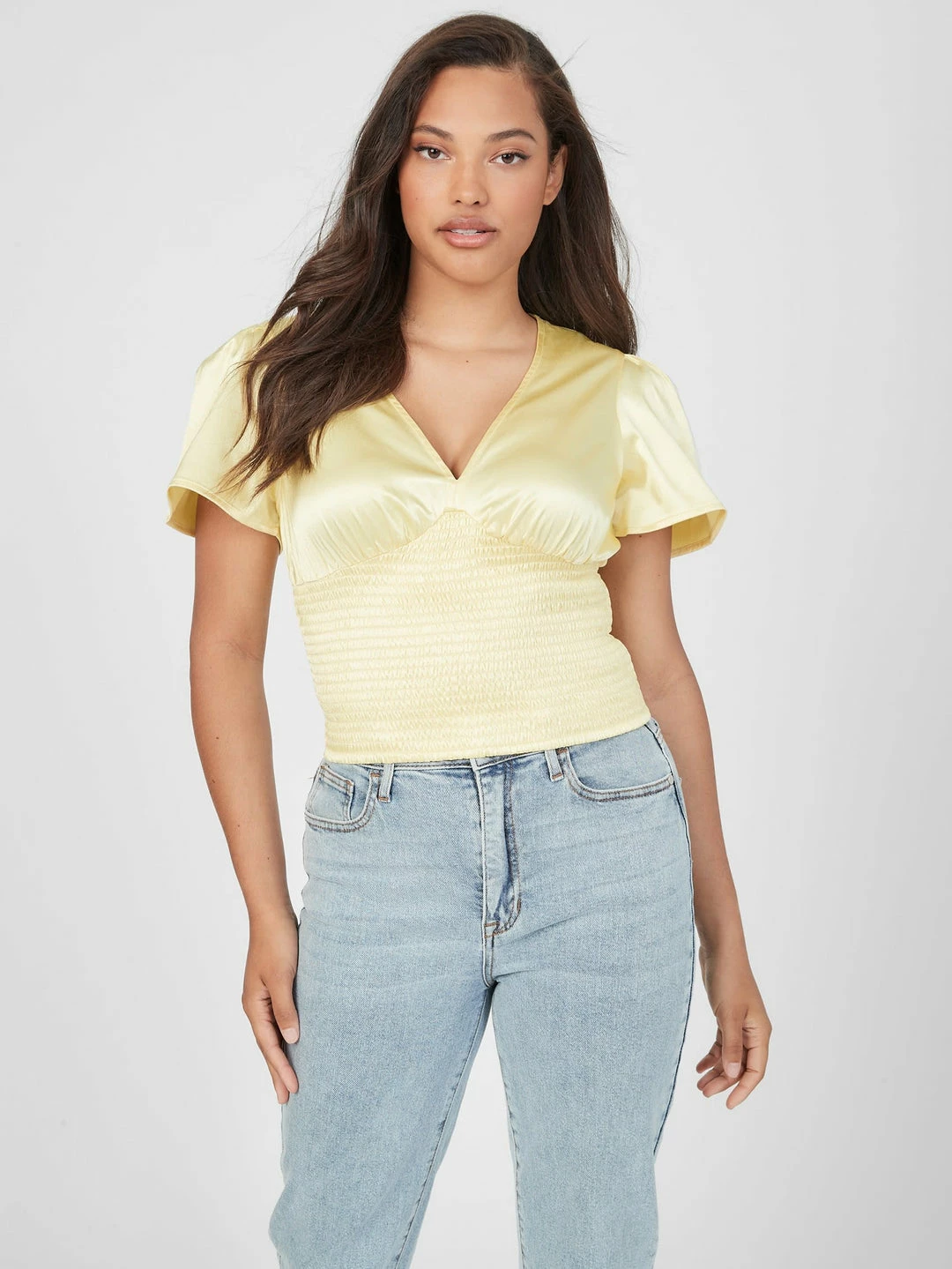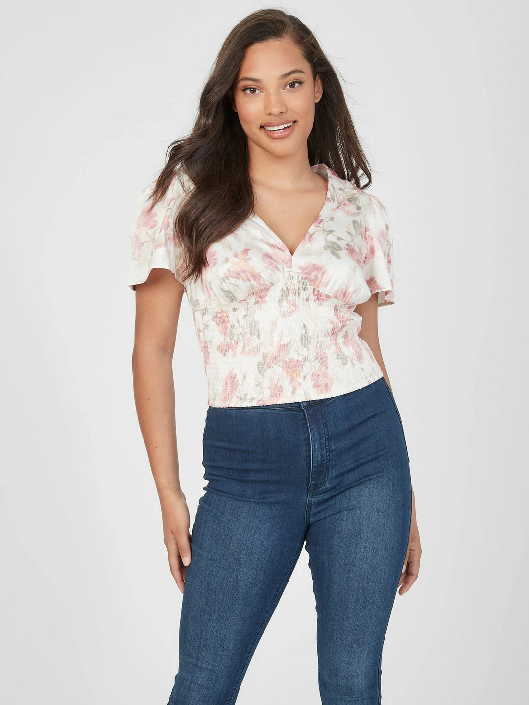 Romantic and sweet, this breezy top features a deep V-neckline and smocked bodice.