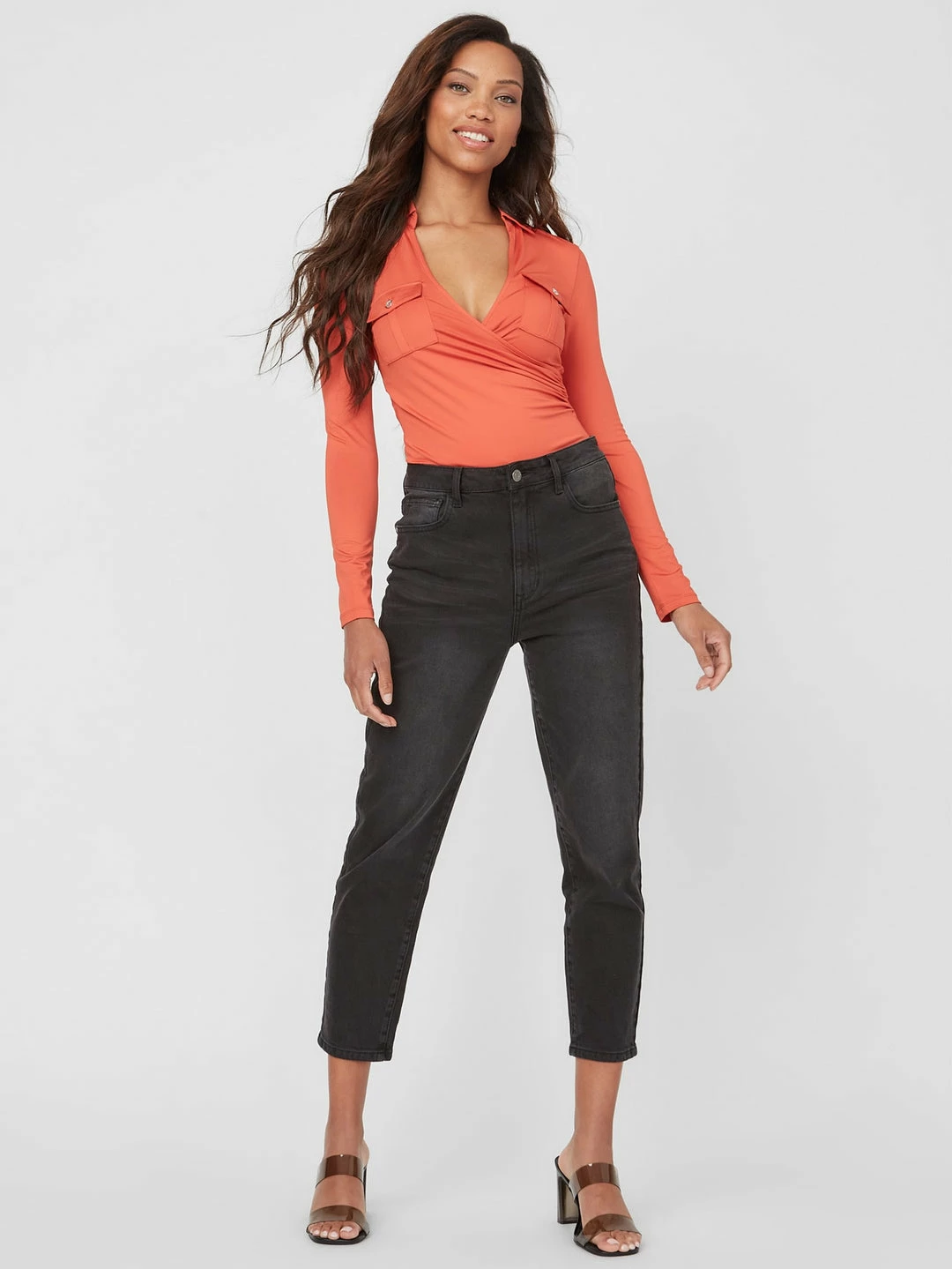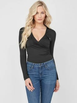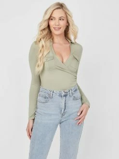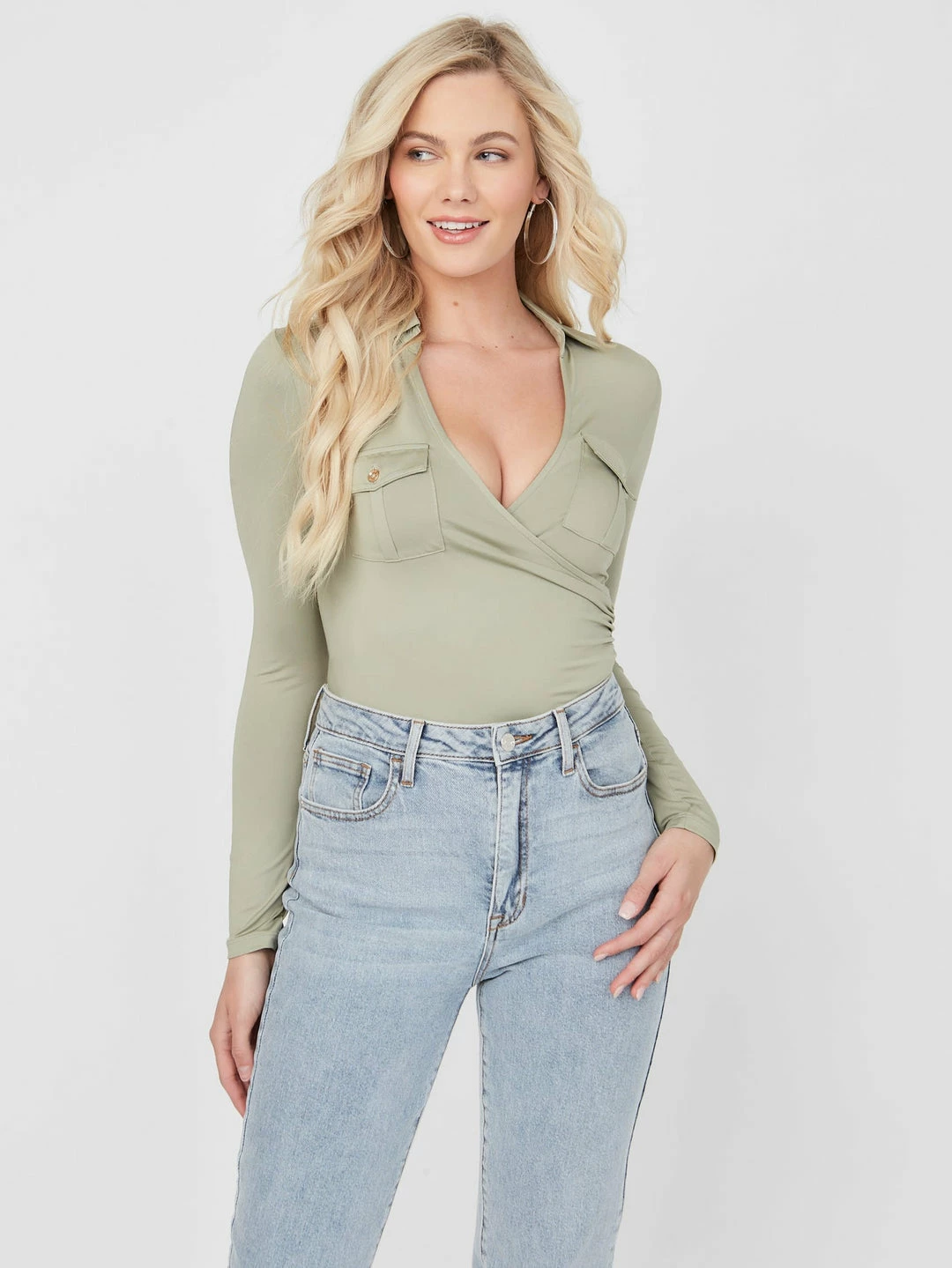 A new take on a classic style, this sleek long-sleeve top features a folded collar and unexpected surplice V-neckline with dual chest pockets.