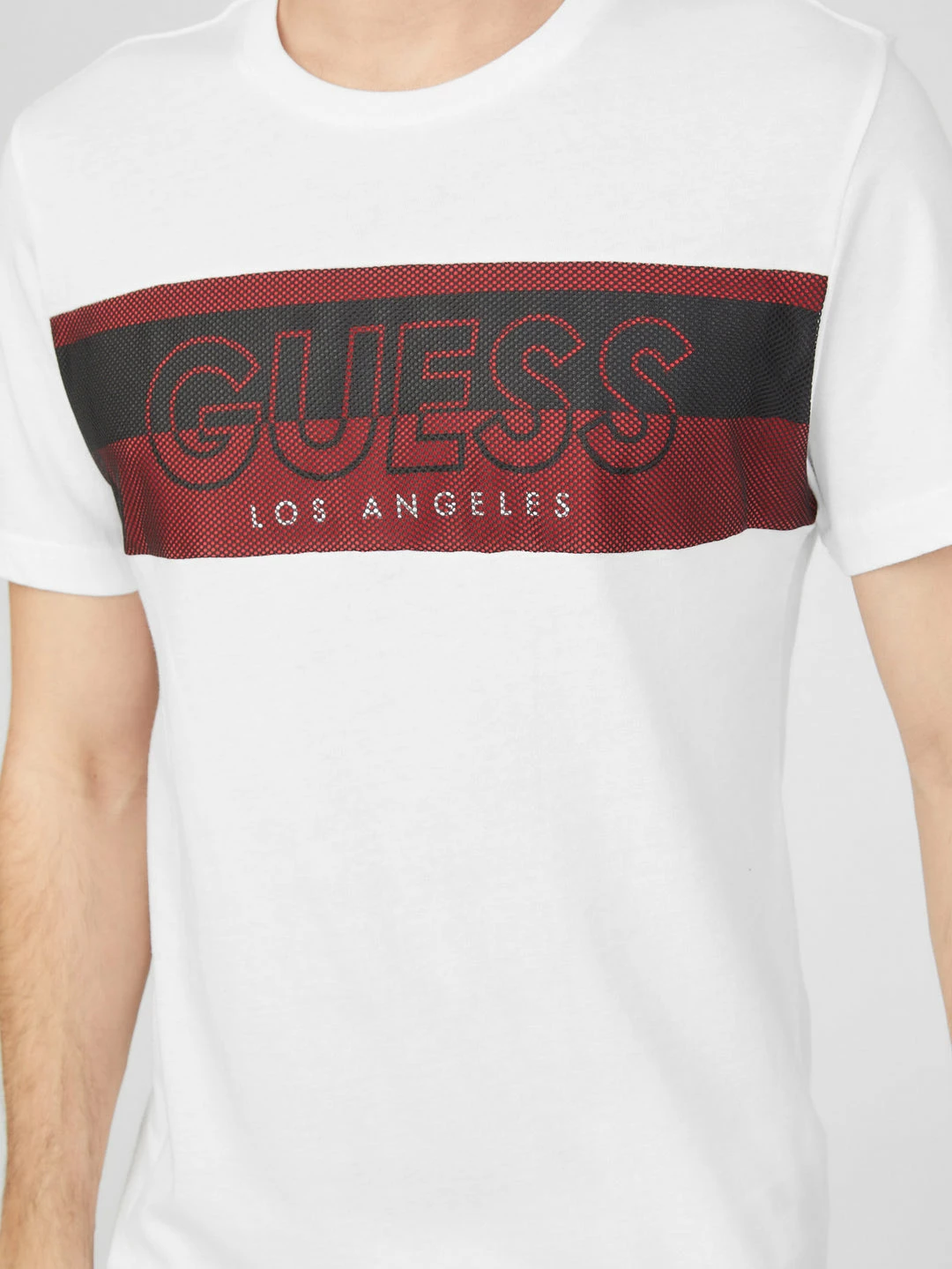 Crewneck tee featuring logo text at front with mesh overlay.