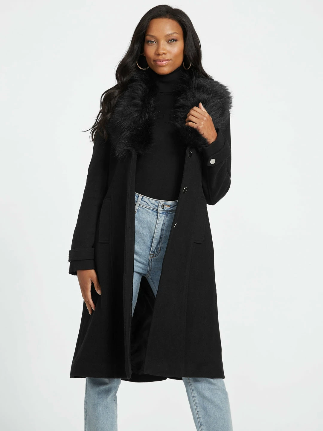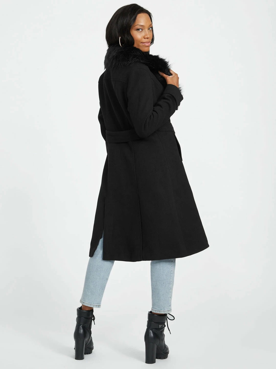 A chic finish to your cold-weather look, this wool-blend coat is designed with a cozy faux-fur collar, a belted waist, front button closures and side slip pockets.