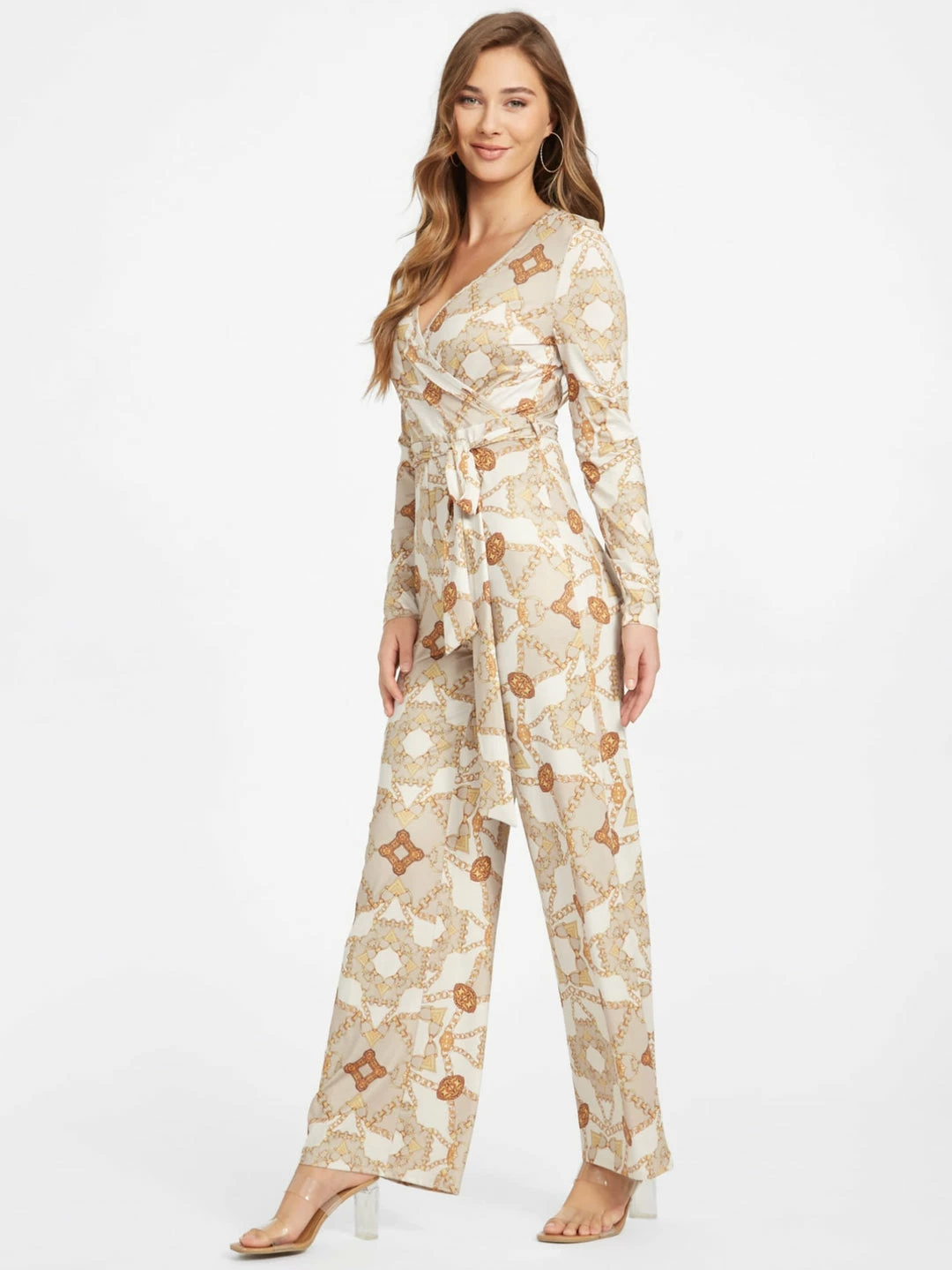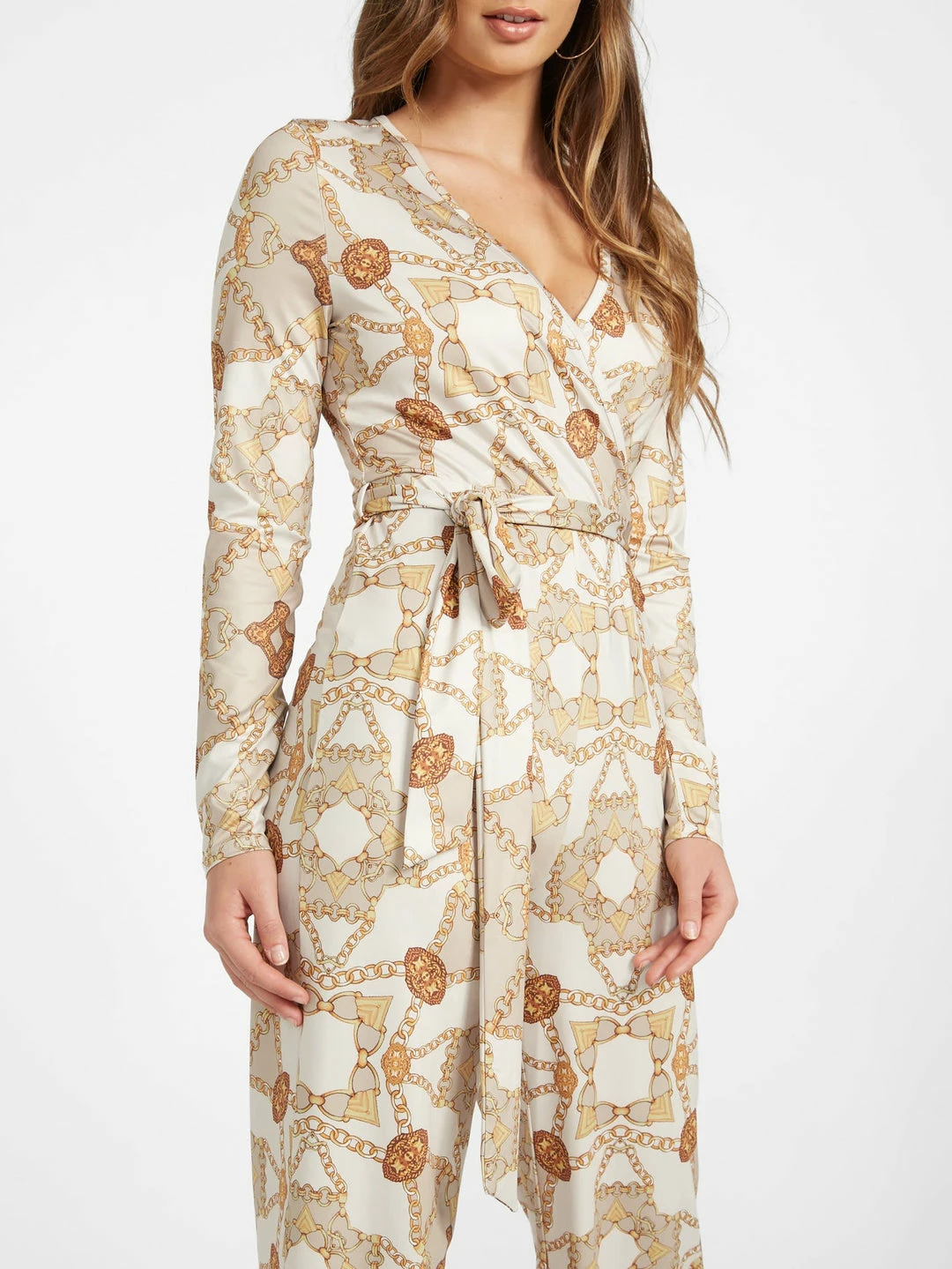 Eye-catching and bold this slinky, stretch-satin jumpsuit features a surplice neckline, long sleeves, wide legs and a matching waist-tie belt.