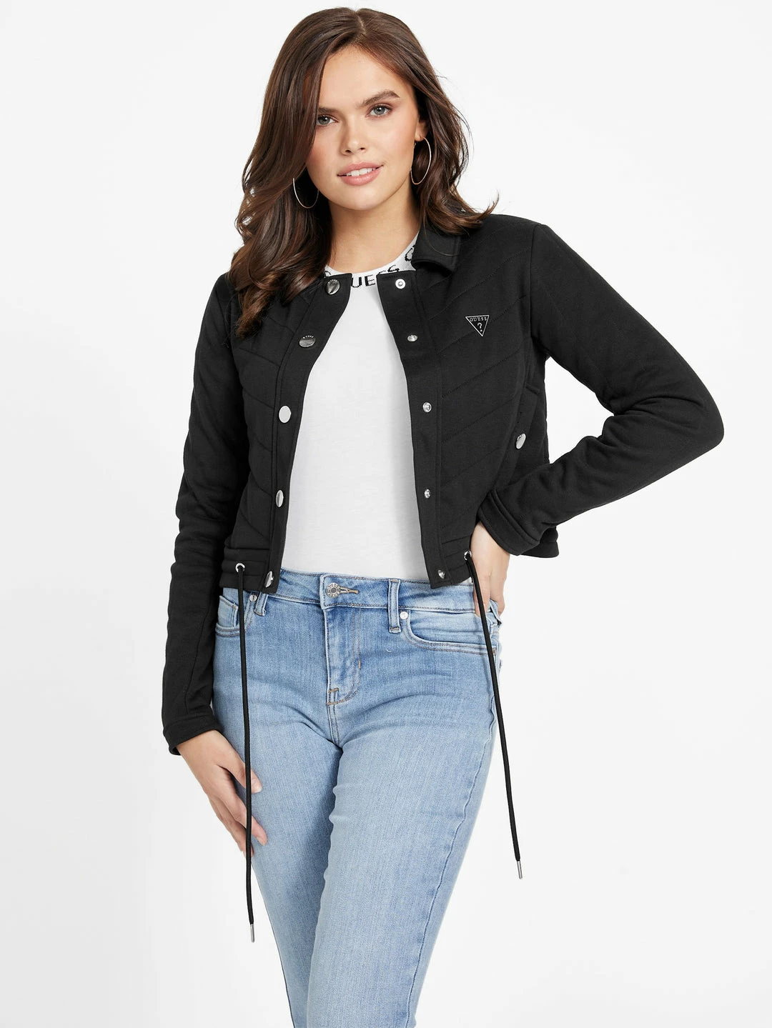 Update your layers with this quilted jacket designed in a soft sueded fabrication. Features a folded collar, side pockets and front snap-button closures. Slightly cropped bottom hem with drawstrings.