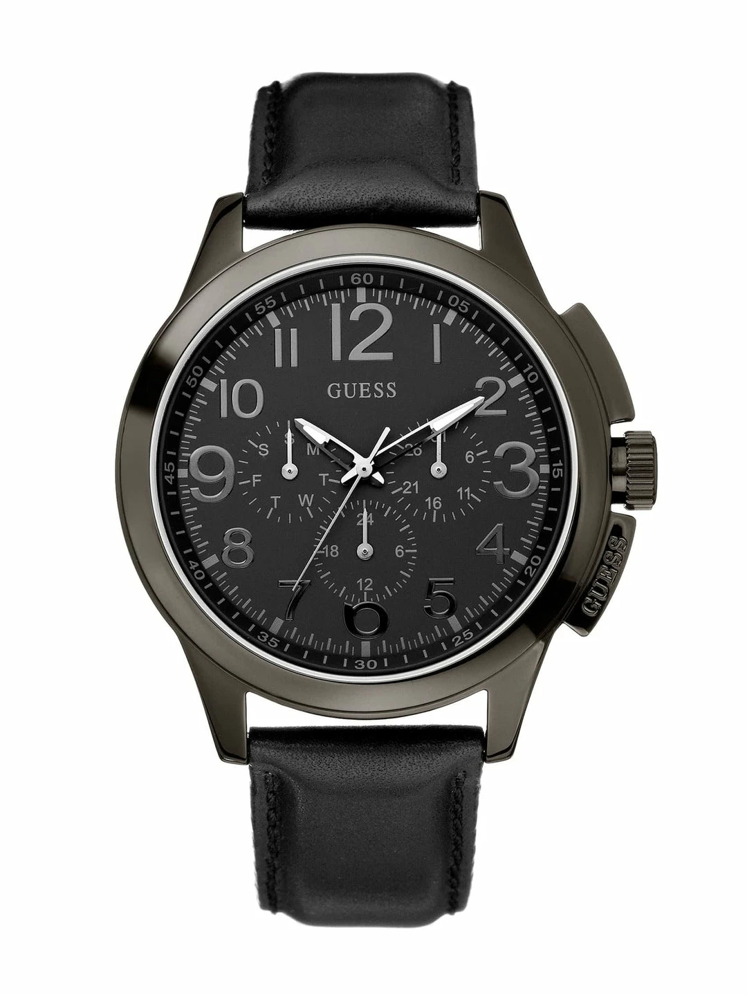 A traditional design with modern details, this black analog watch is a must for the style-savvy guy with a multifunction dial and white-tipped hands.