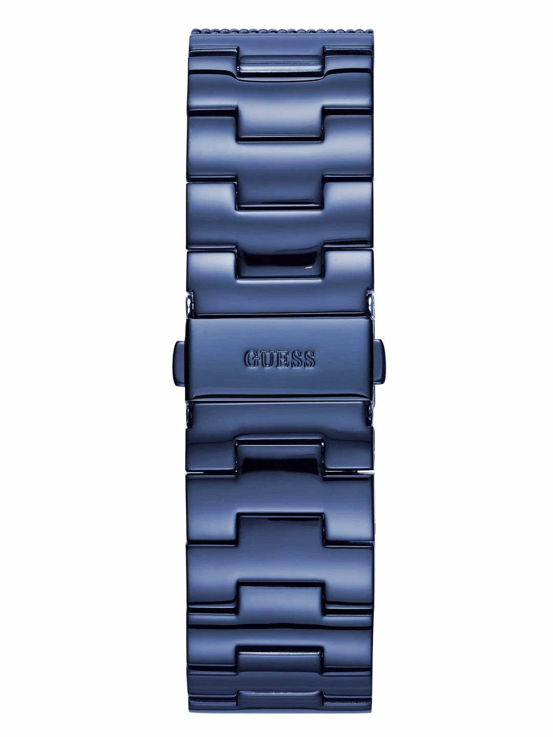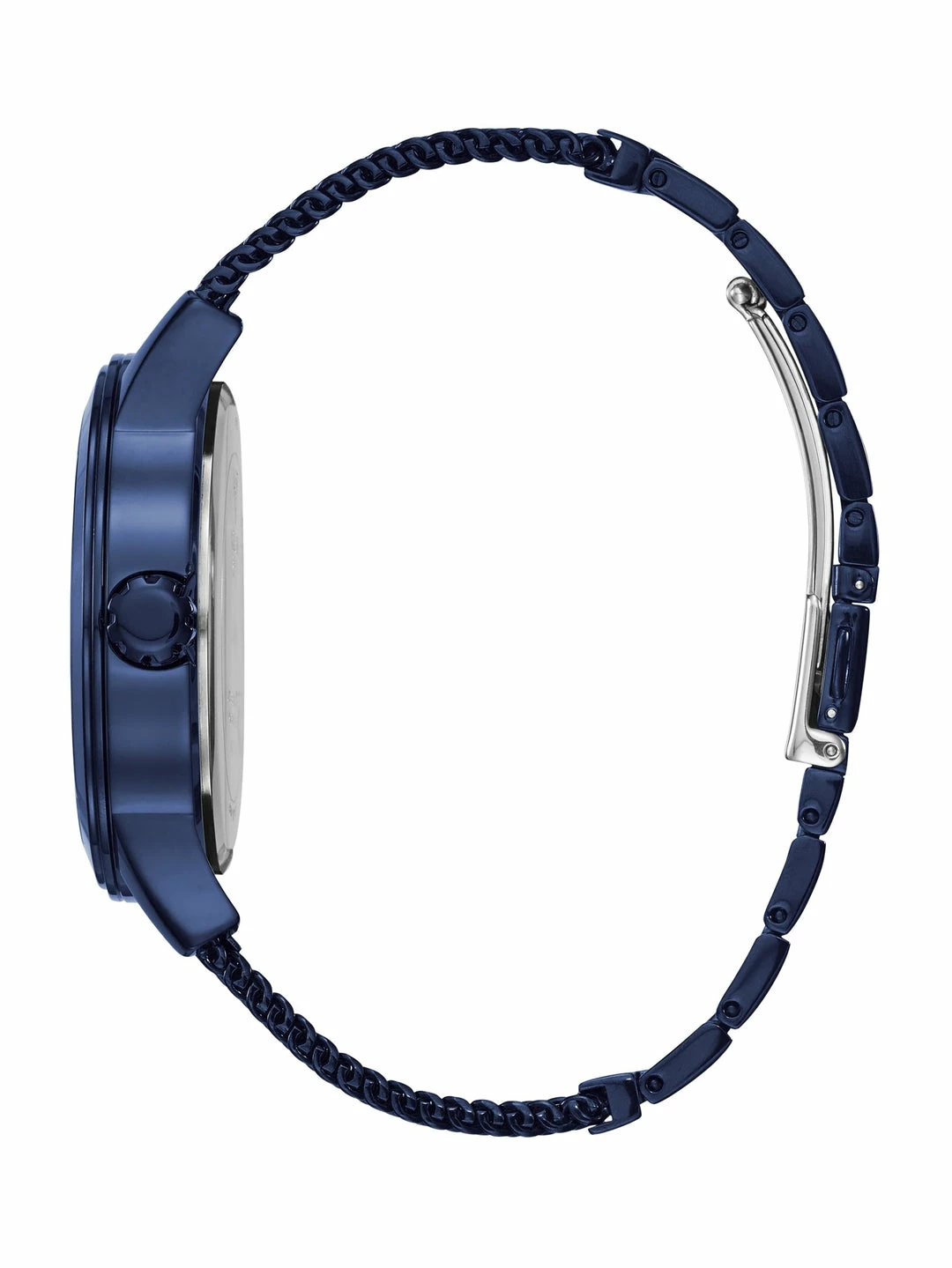 A modern timepiece sporting a classic silhouette. This analog watch features an all blue minimalist design with a mesh strap, crystal markers and logo detail.