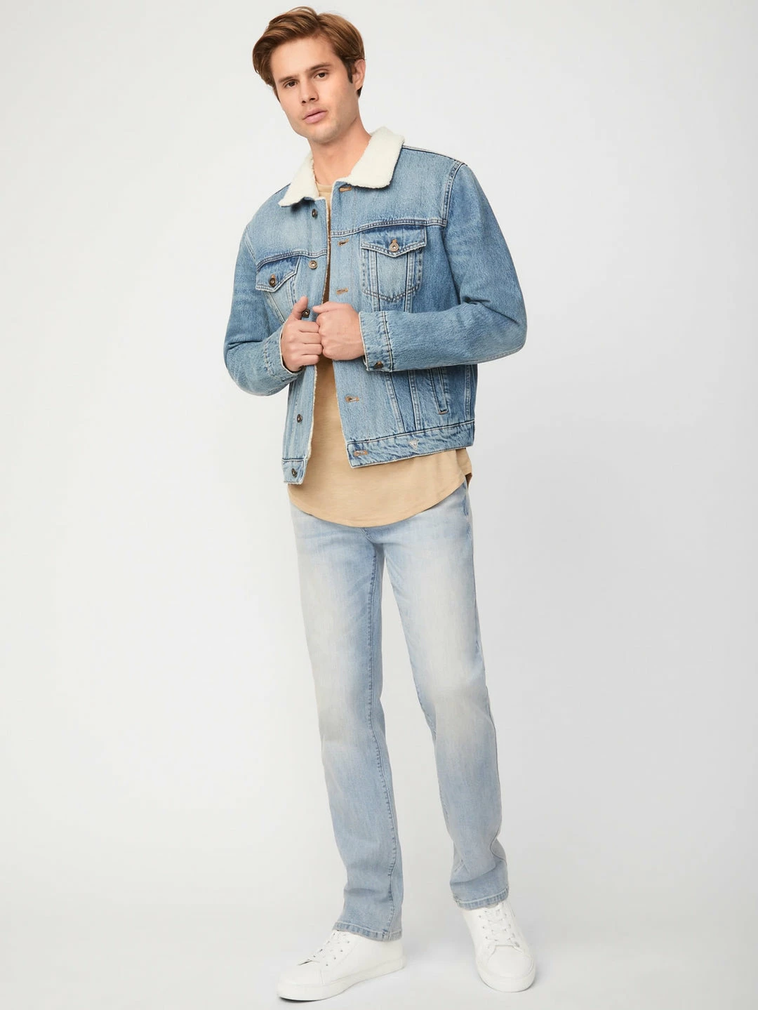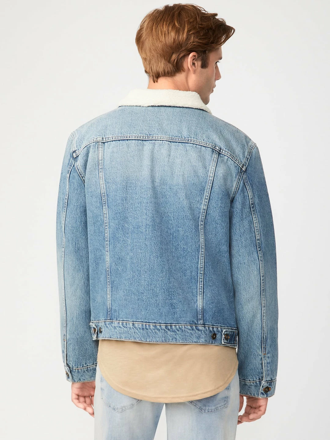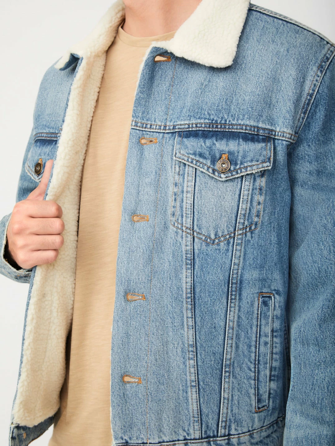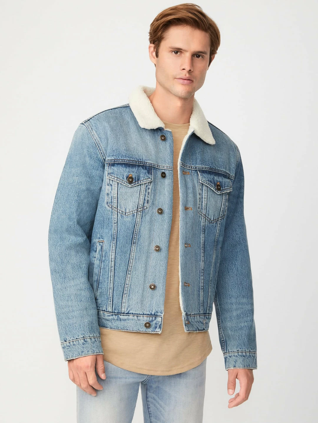 Denim jacket featuring a sherpa lining, front pockets and button-front closure.