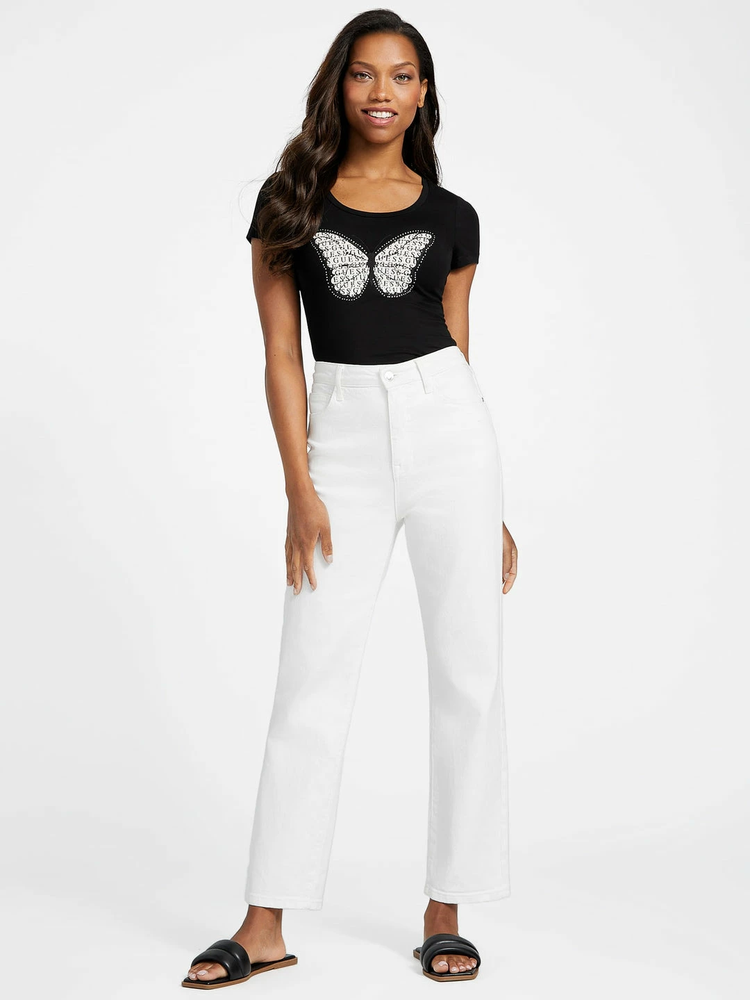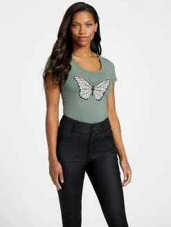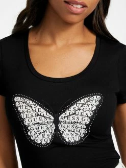 Simply a must-have, this short-sleeve tee features a scoop-neck and butterfly graphic at front with logo text inside the wings and rhinestone accents.
