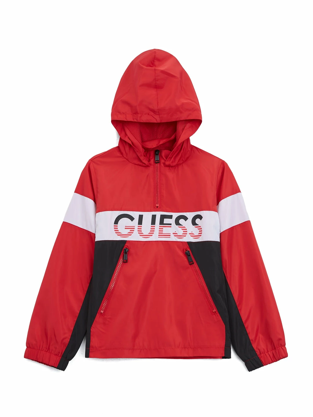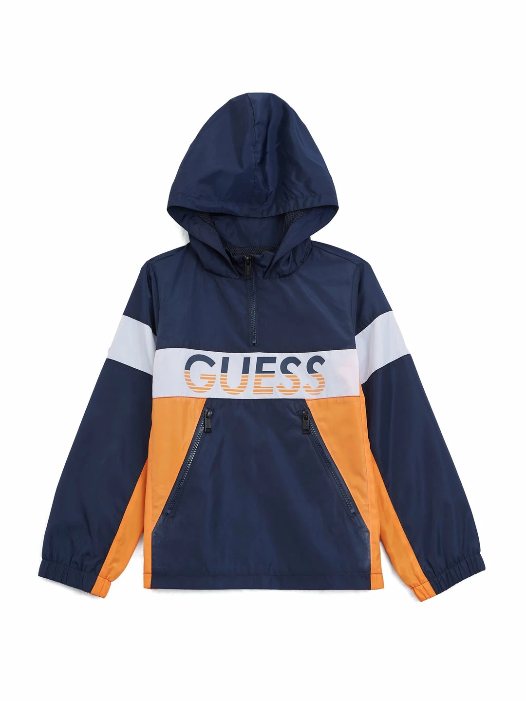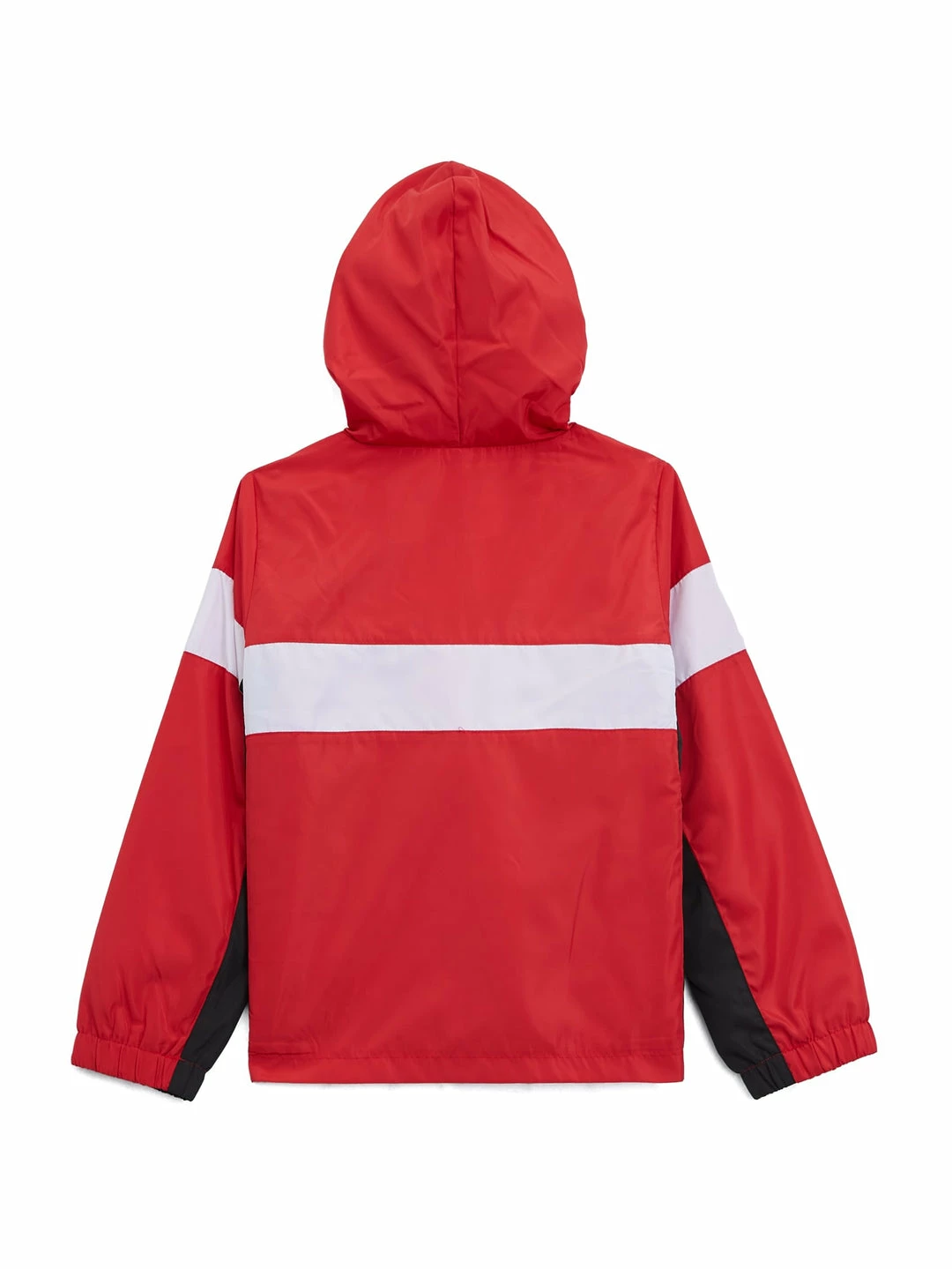 Keep them warm in this color-block windbreaker. Designed with a nylon fabrication, half-zip chest with hood, striped logo and dual zip pockets.