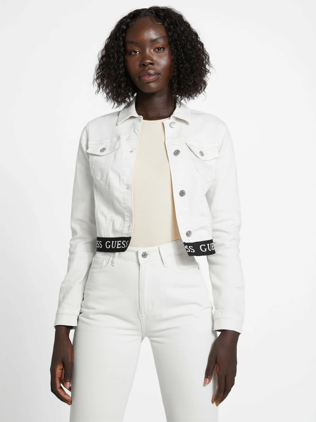 A cute denim jacket featuring a logo trim hem, cropped fit, chest pockets and a button-front closure.