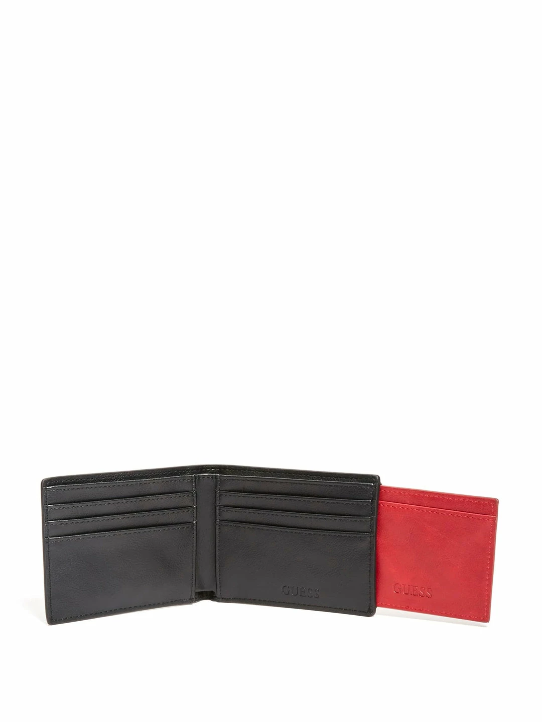 Smooth faux-leather wallet features a bifold design with a removable card case featuring an ID window.
