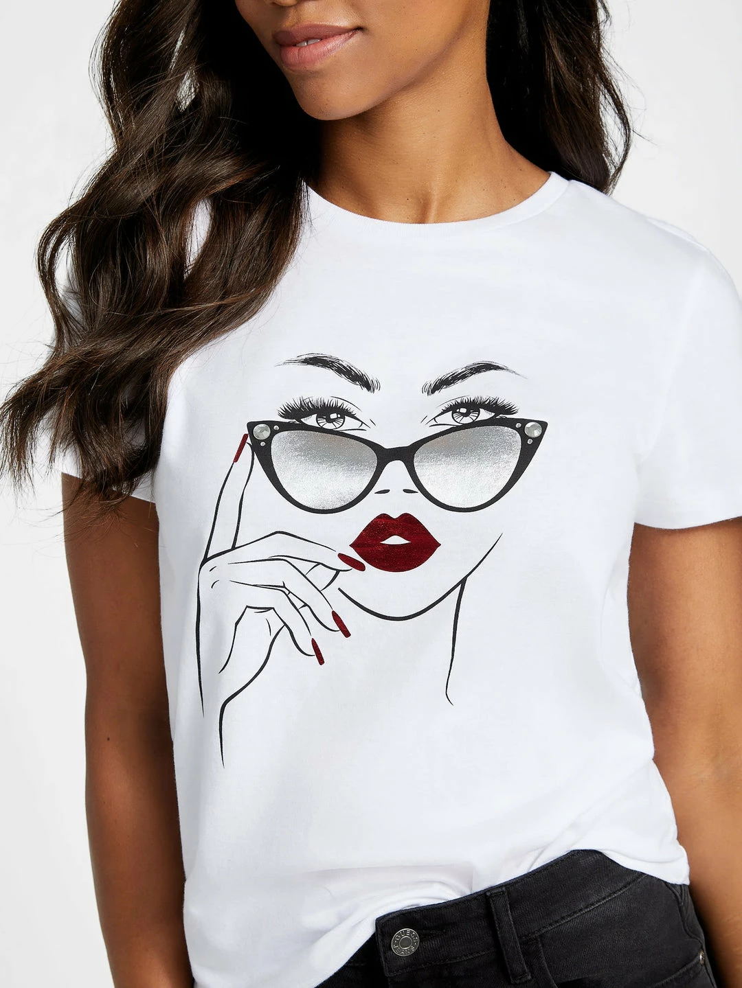 Top off your look with this short-sleeve crewneck tee featuring a model graphic at front with metallic foil details for added shine.
