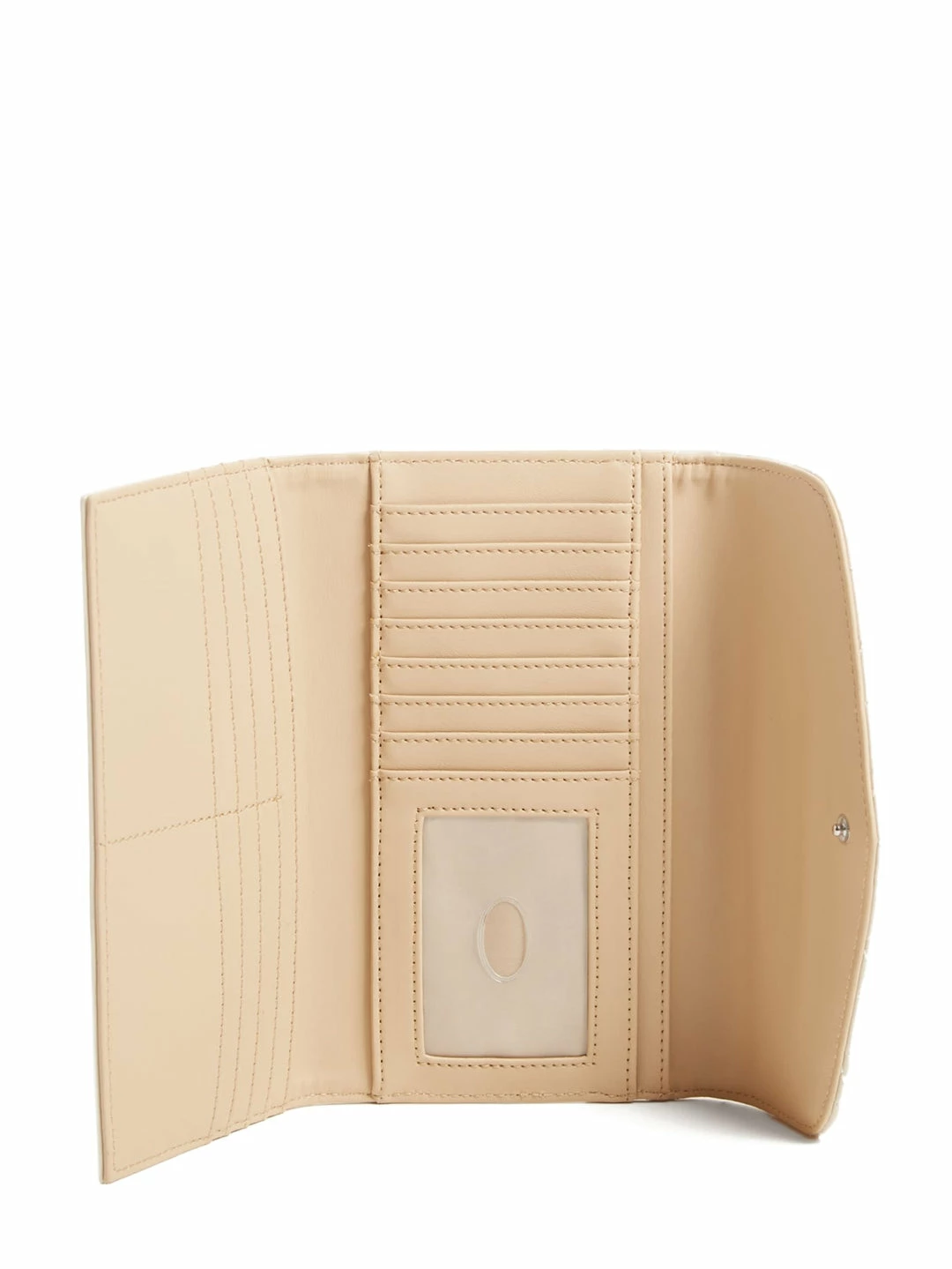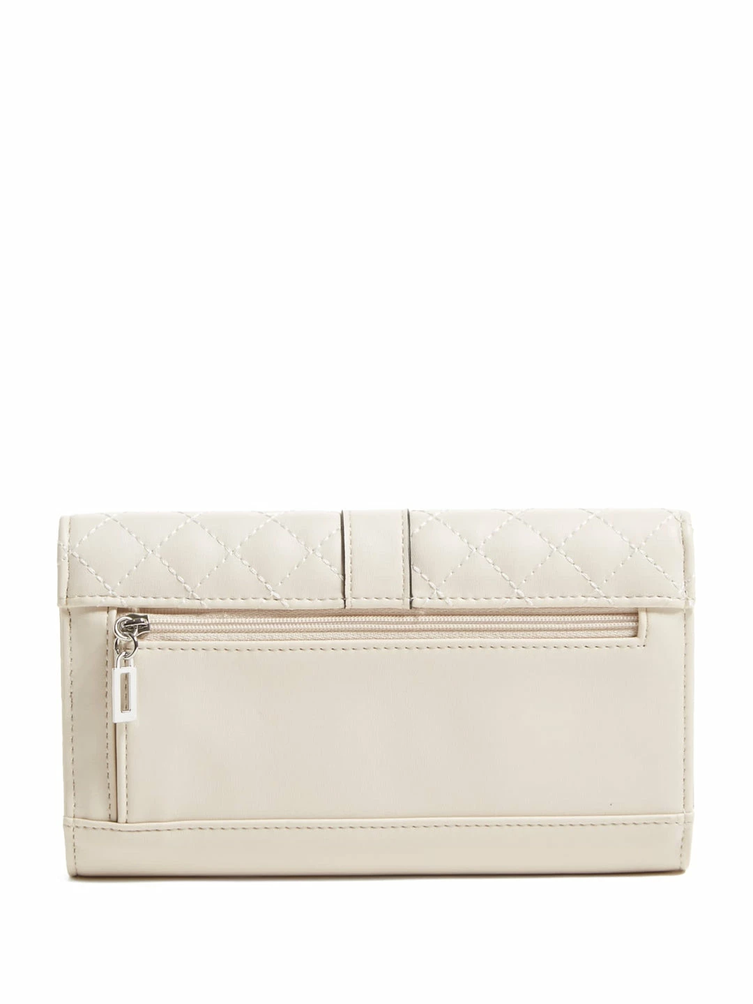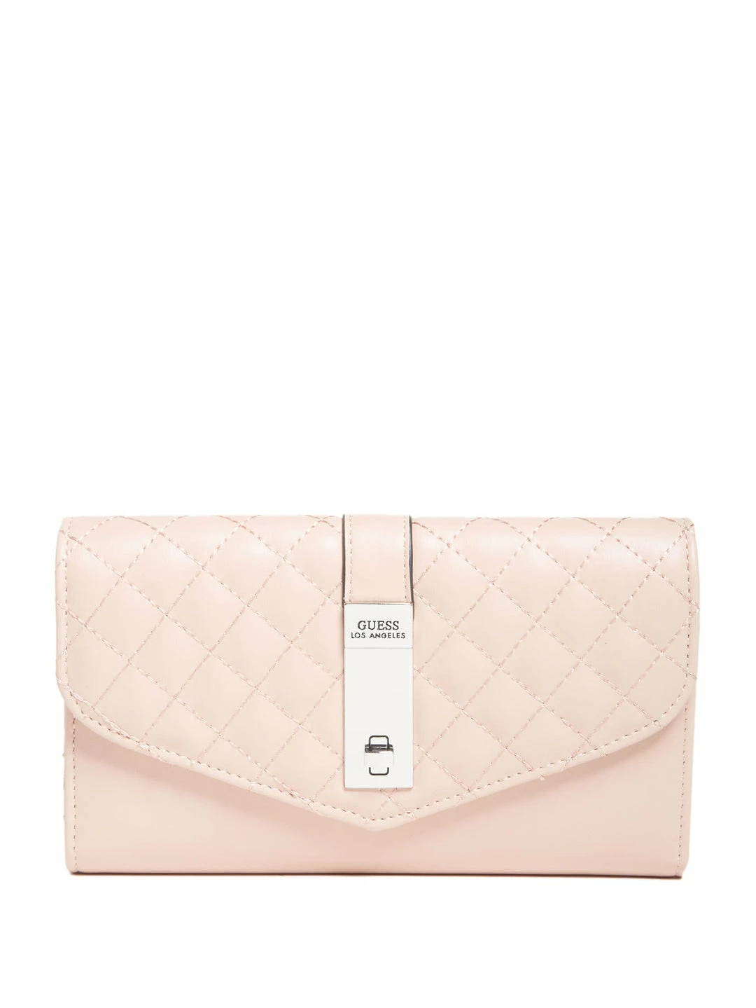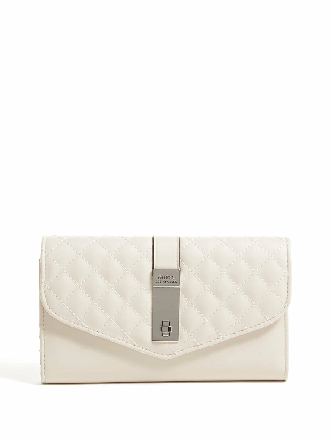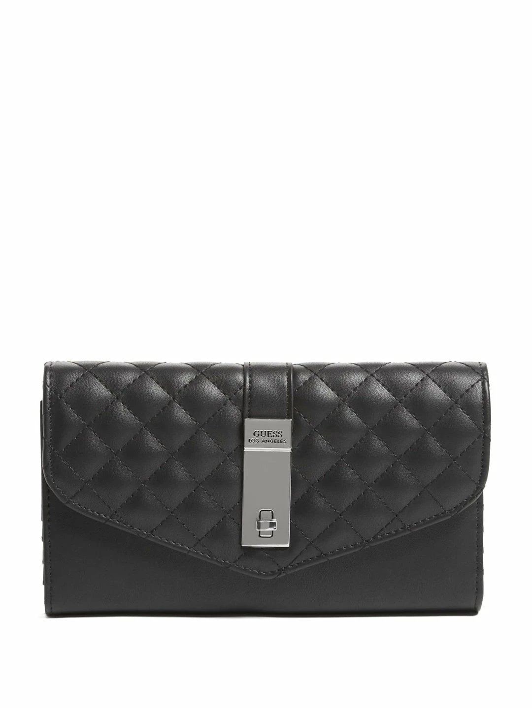 For your most valuables, this faux-leather clutch is featured in a quilted design with a fold-over flap closure and front logo icon.