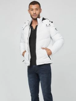 An ideal layer for cold weather, this nylon puffer jacket features a detachable hood with drawstrings, side slip pockets and front zip closure.