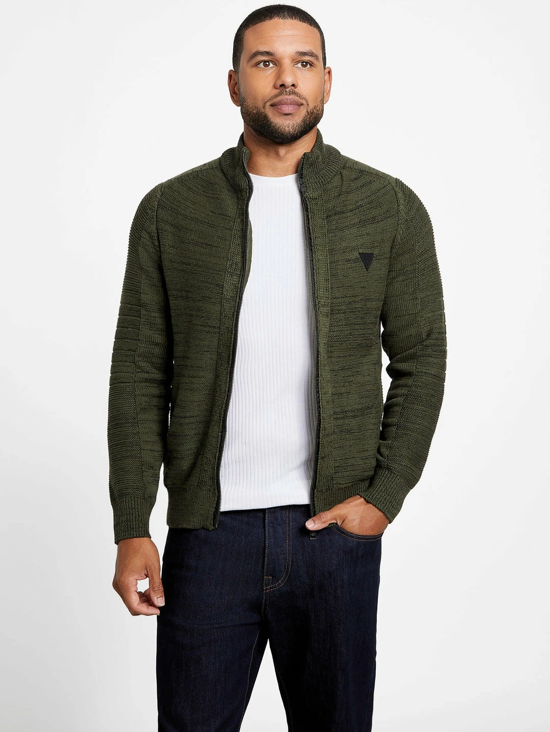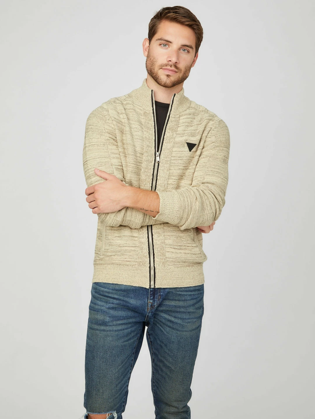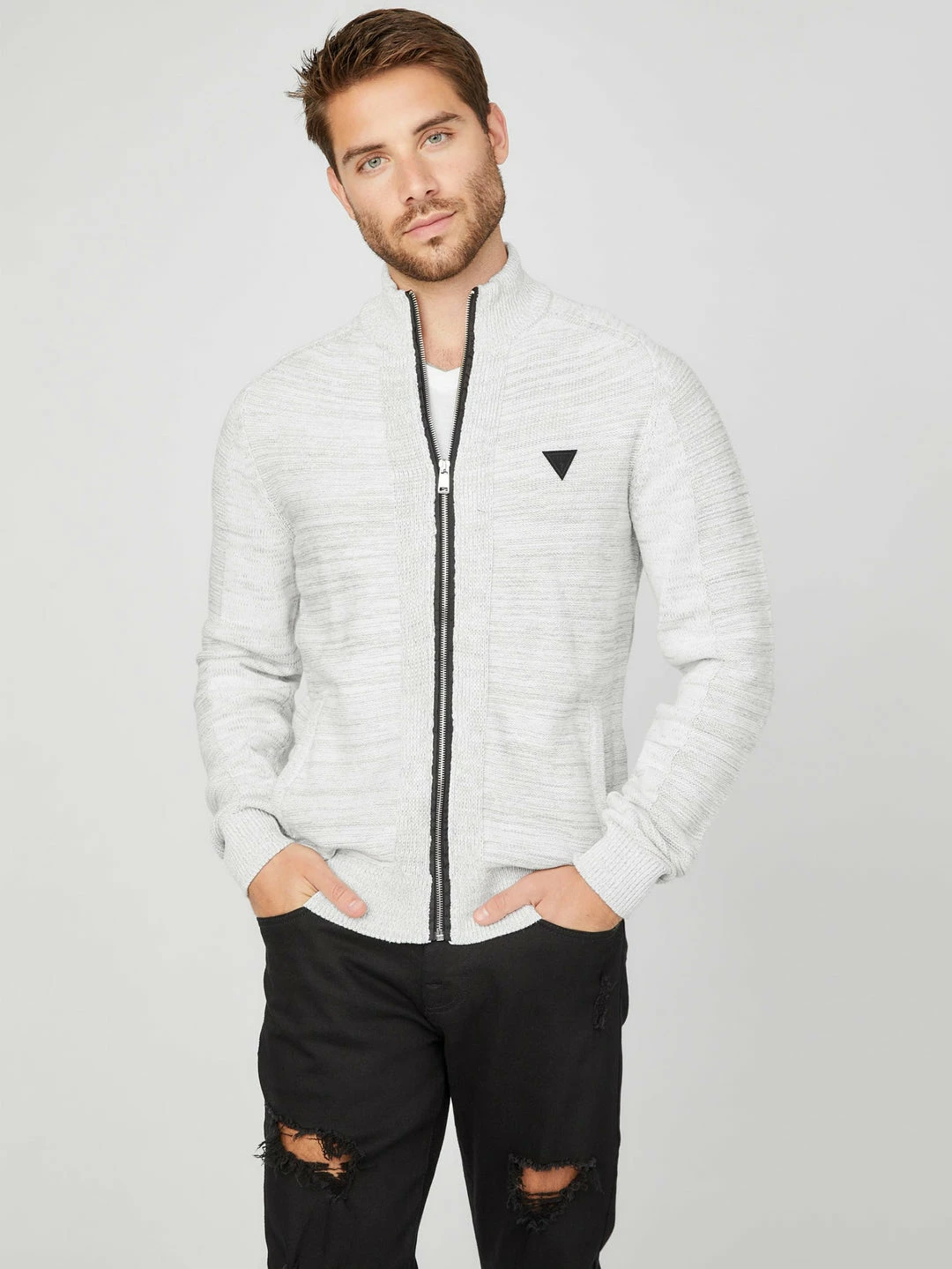 Crafted in a marled knit fabrication, this zip-up sweater features a mock neck, front logo patch and side slip pockets.
