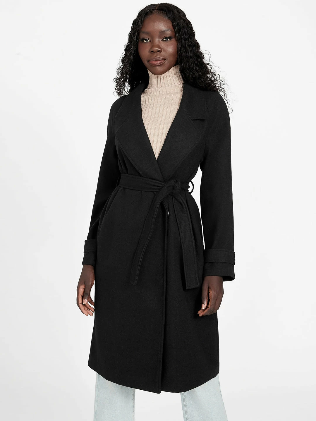 With timeless elegance, this coat is a closet staple. Featuring a wool-blend fabrication, lapel collar and waist belt wrap.