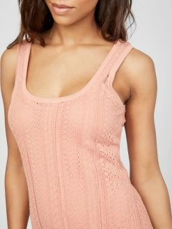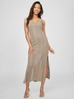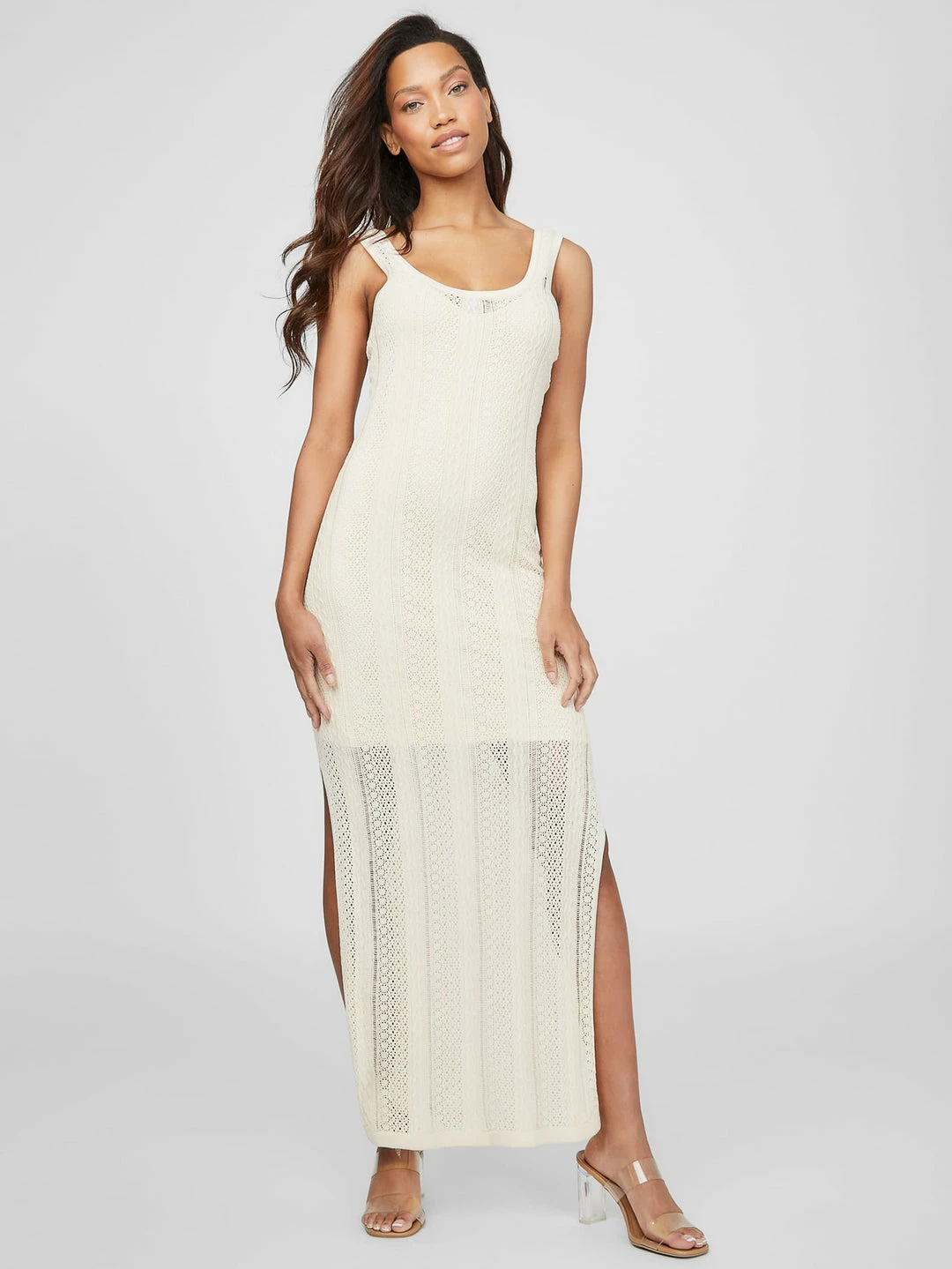 Simply a must, this scoopneck dress is designed in a flattering maxi silhouette with above-the-knee lining and an open-knit finish with side slits.