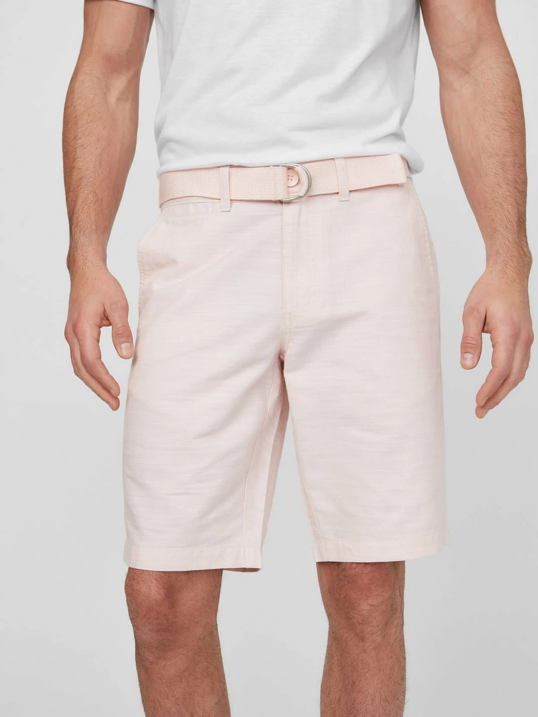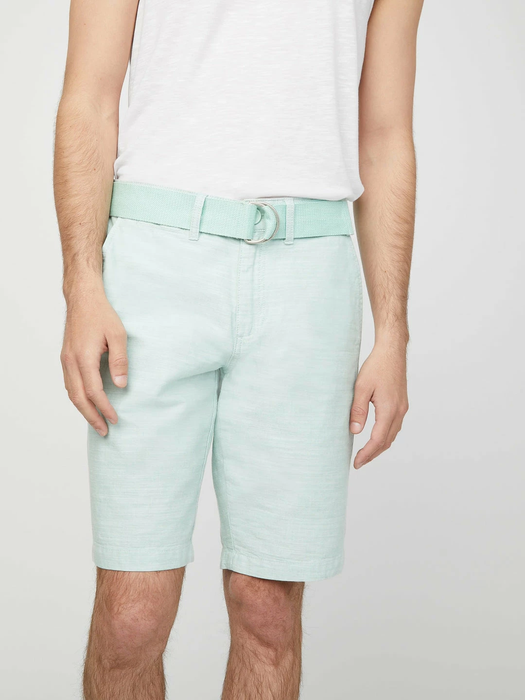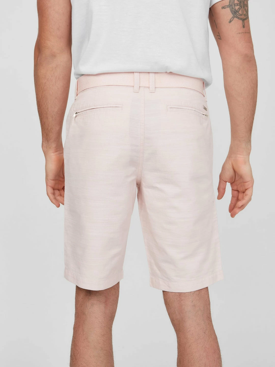 An upscale pair of textured, flat-front shorts featuring a five-pocket design with back zippers and a webbed belt with adjustable D-ring closure.