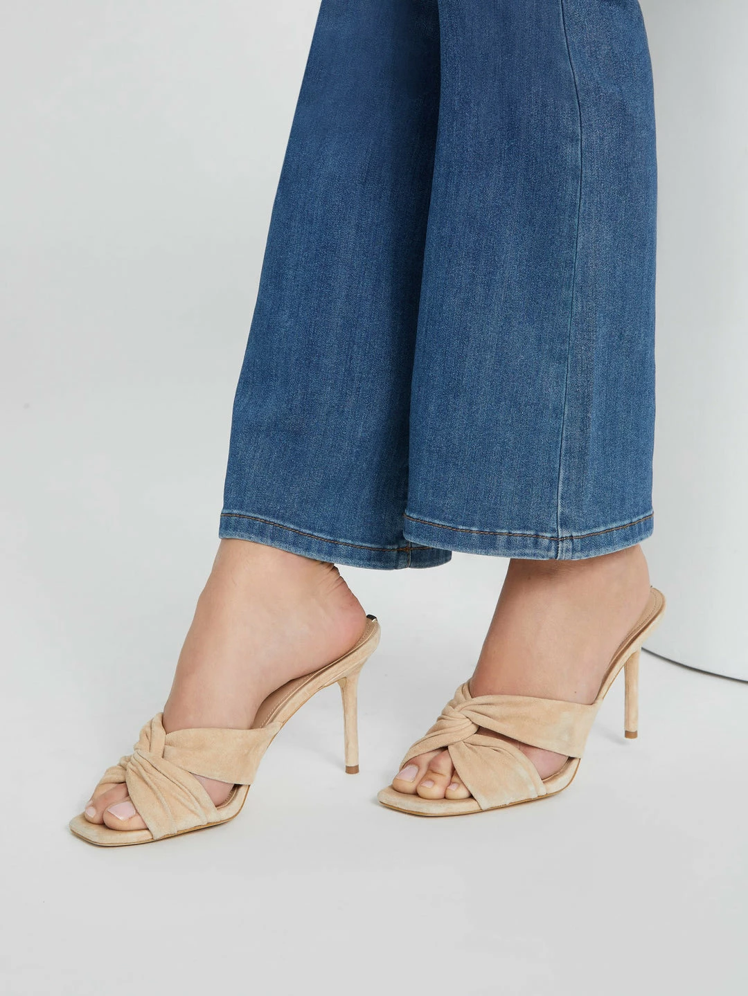 Made in a soft genuine suede fabrication, these slip-on mules feature an on-trend knotted vamp and sharp stiletto heel.