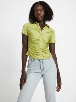 A slinky top featuring a folded collar, short sleeves, a ruched placket and a button-front closure.