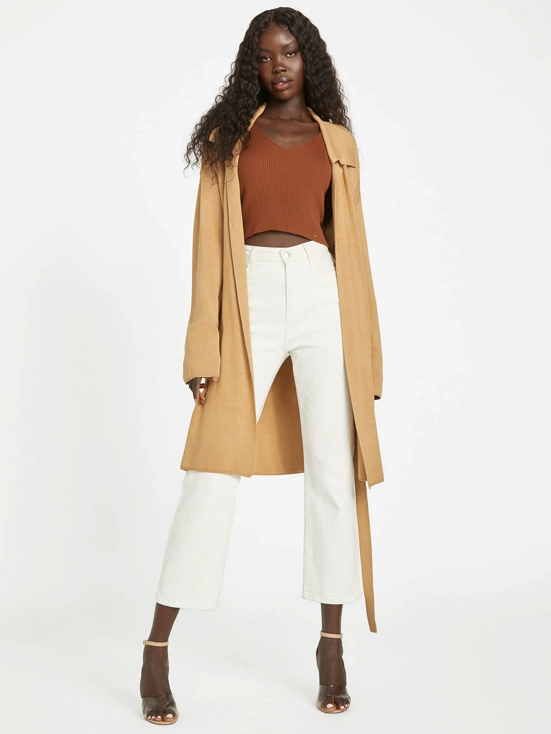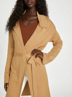 Complete your look with this fine-knit cardigan sweater styled in a longline silhouette with notched collar and open-front design with fabric belt at the waist.
