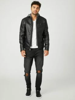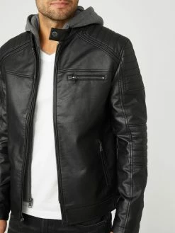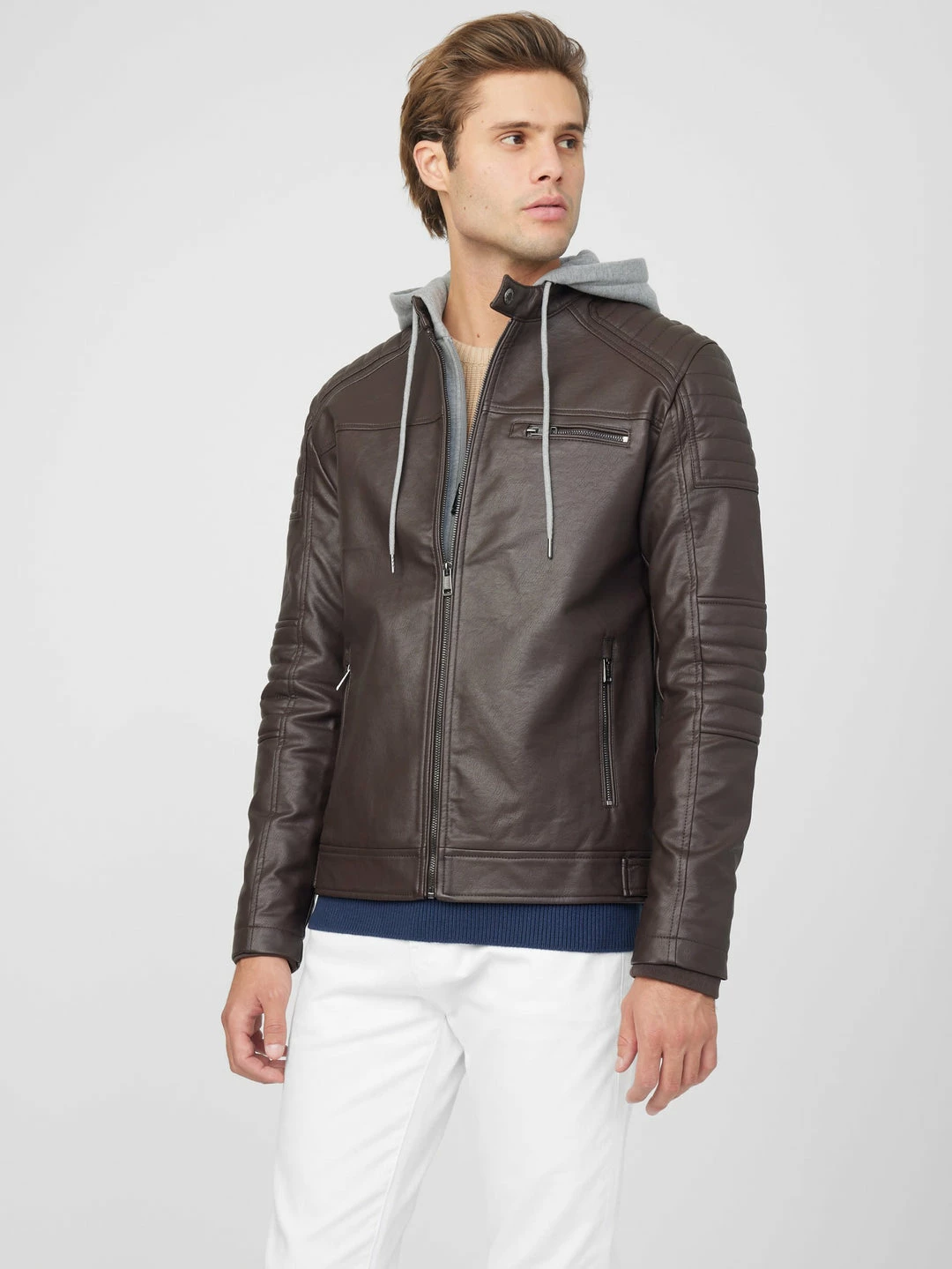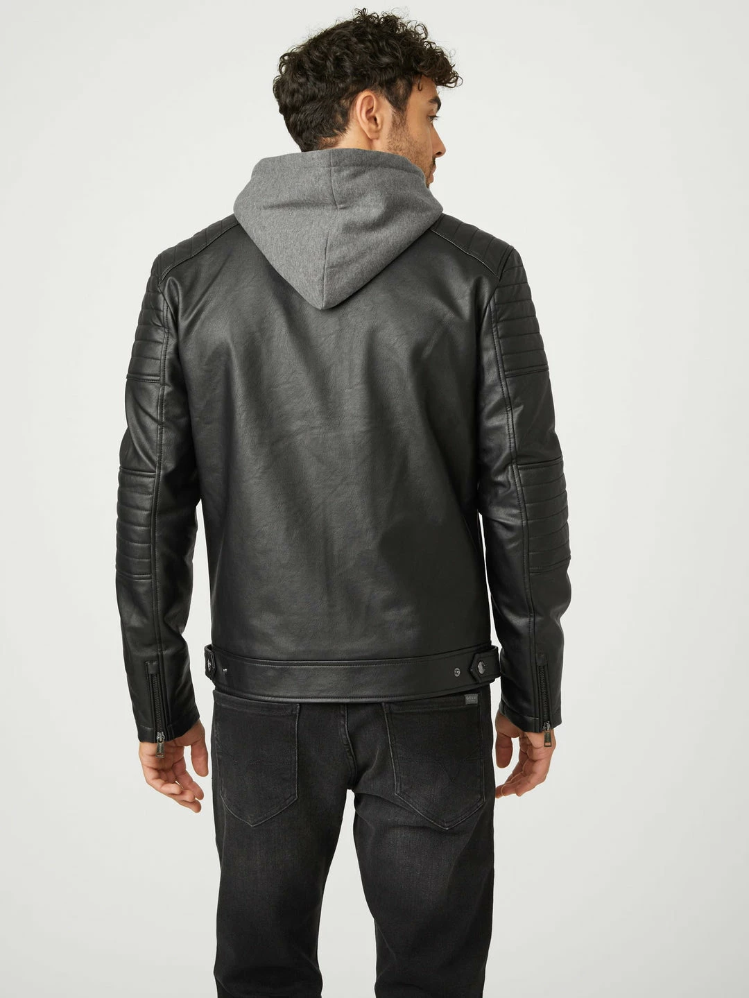 Complete your look with this faux-leather biker jacket featuring quilted padding along the long sleeves and a removable hooded jersey cotton inset. Chest zip pocket and front zip closure.