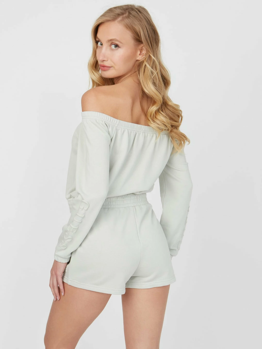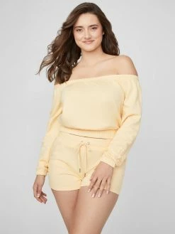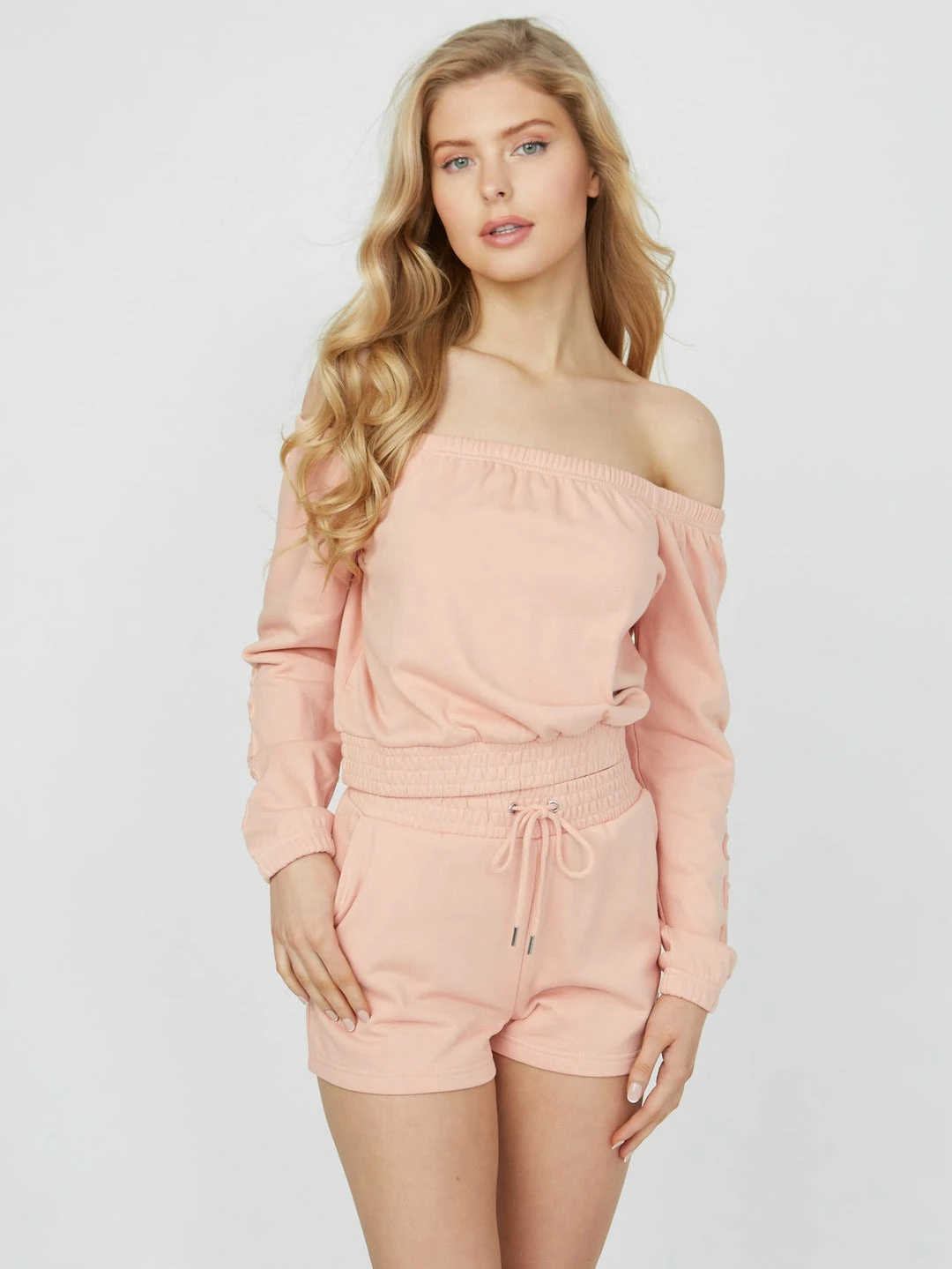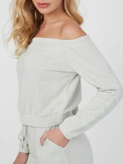 Switch up your casual look with this sweatshirt featuring an off-the-shoulder neckline, elastic cropped hem and logo text at sleeve.