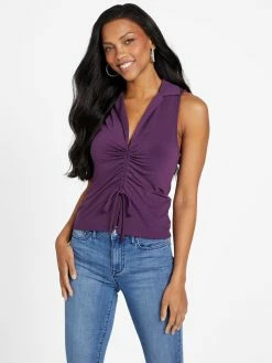 Late night or date night, this sleeveless top features a collared V-neckline and ruched details.