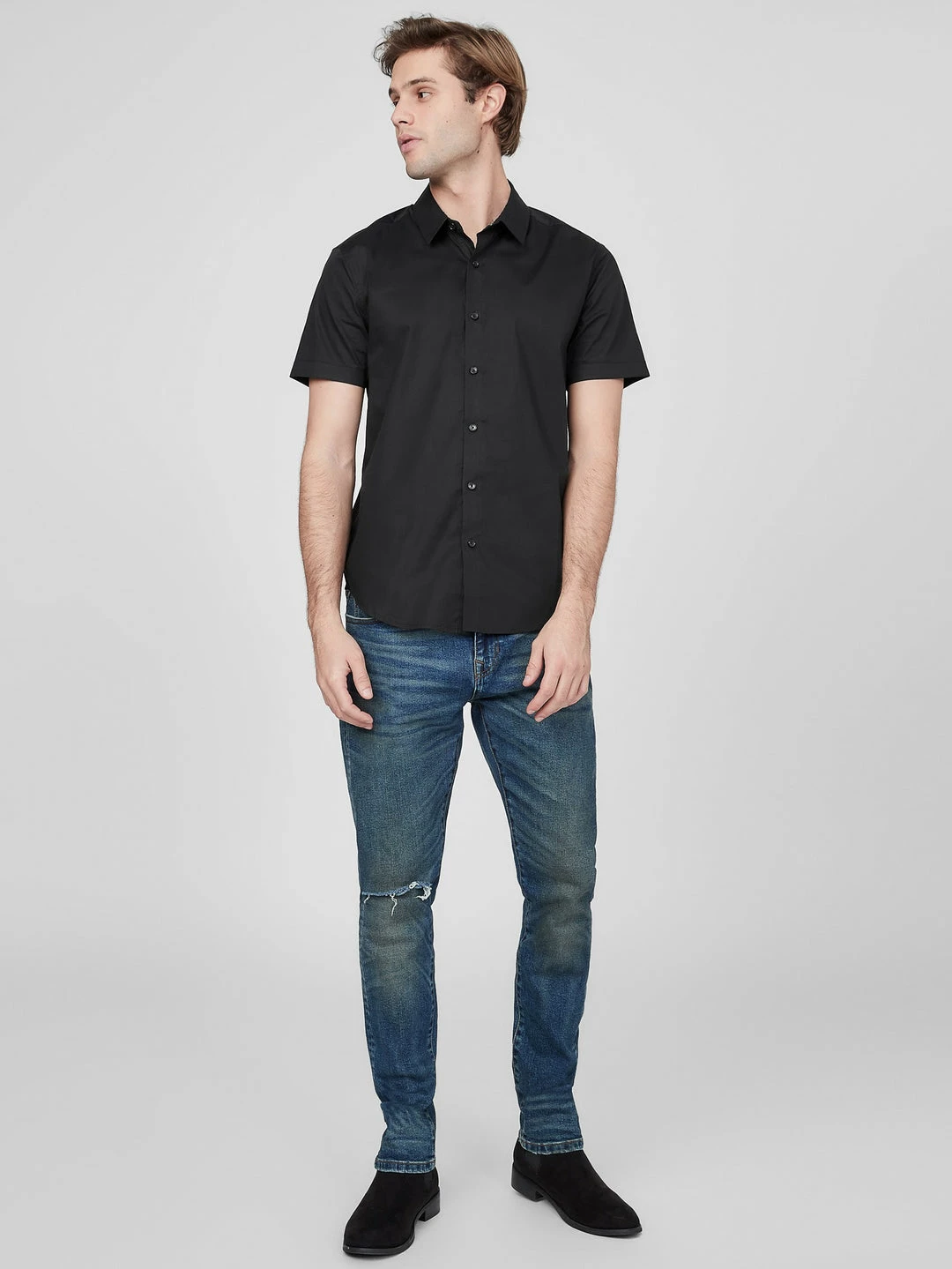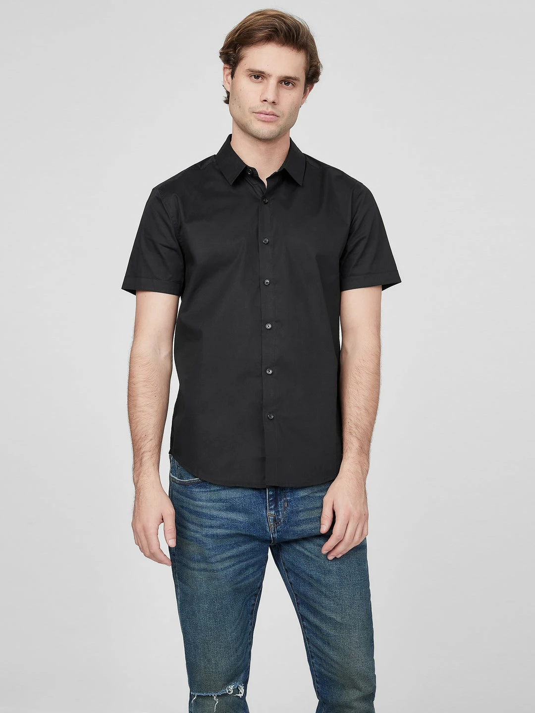 A must-have essential, this classic button-up shirt features a seamless design, folded collar and short sleeves.