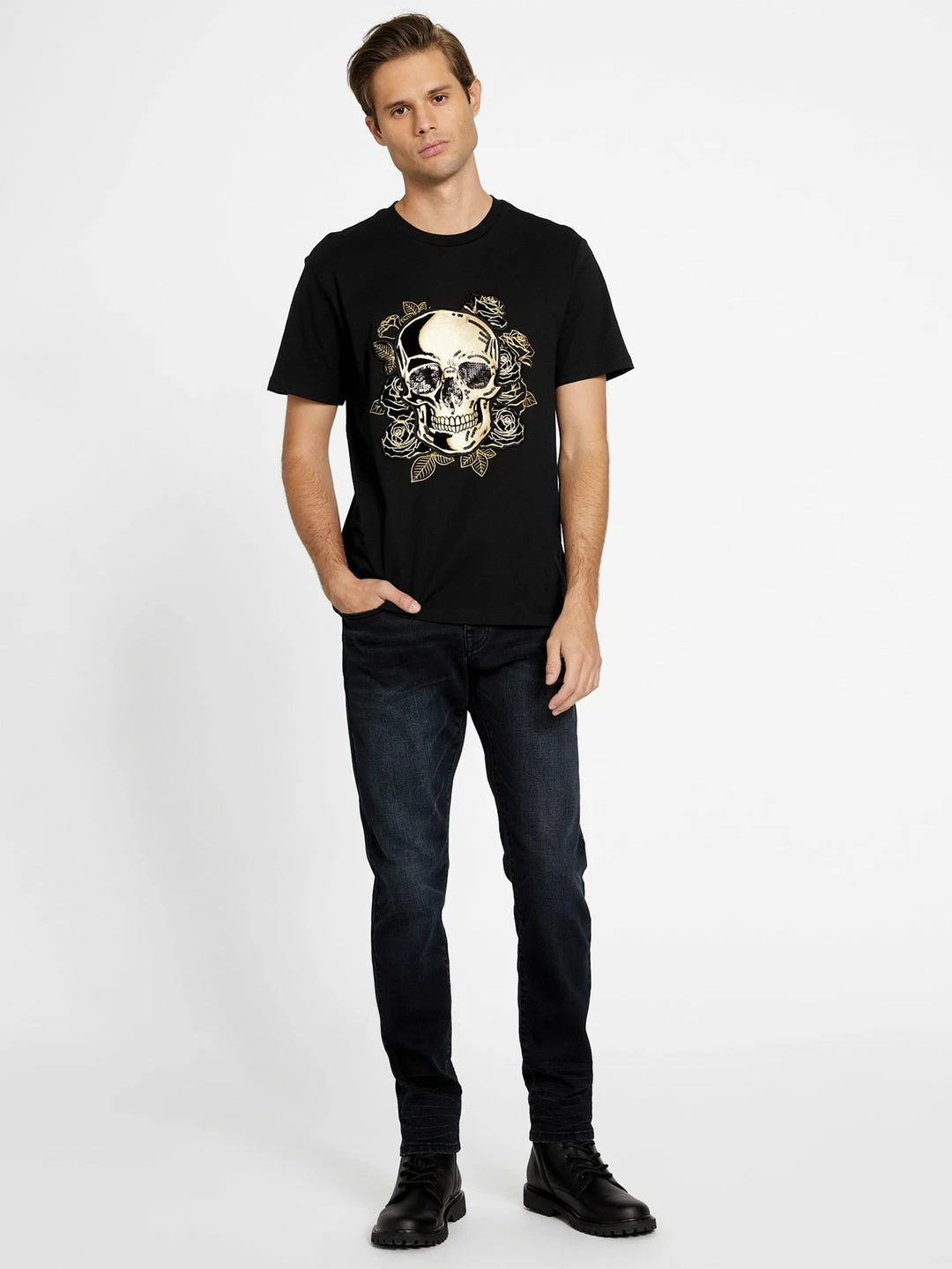 Give your everyday look an edge. Tee designed with a skull graphic, crew neckline and short sleeves.