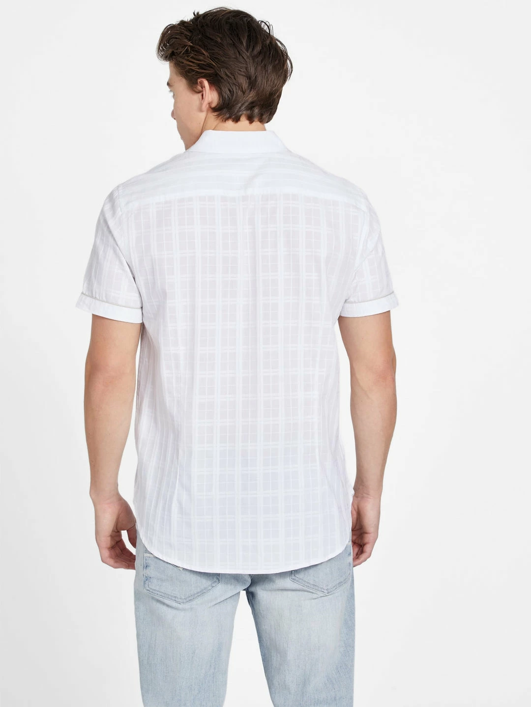 This woven dobby shirt features a textured windowpane design, flap chest pockets, a folded collar, short sleeves, shirttail hem, contrast piping and a button-down closure.