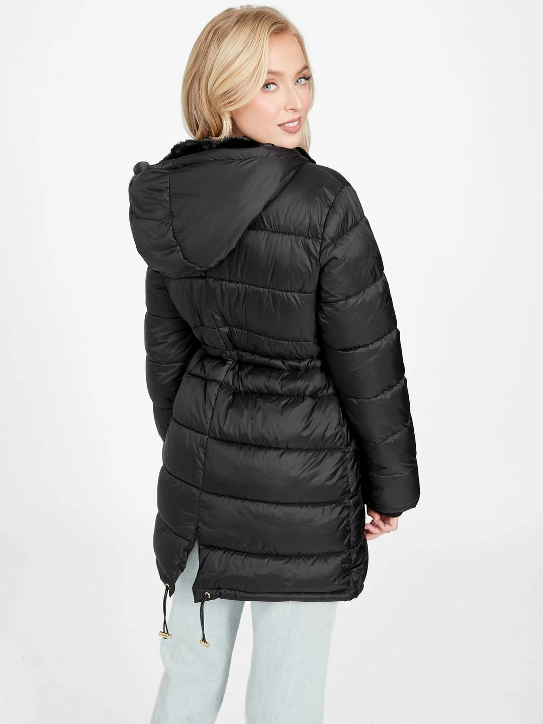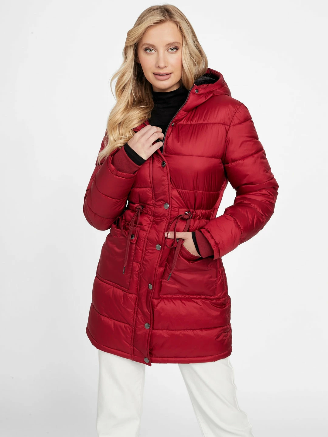 A cold-weather essential, this padded jacket features an attached hood, front zip and fold-over flap pocketing, and drawstrings at the sleeve cuffs and waist for a fitted look. Front zip closure with snap-button security.