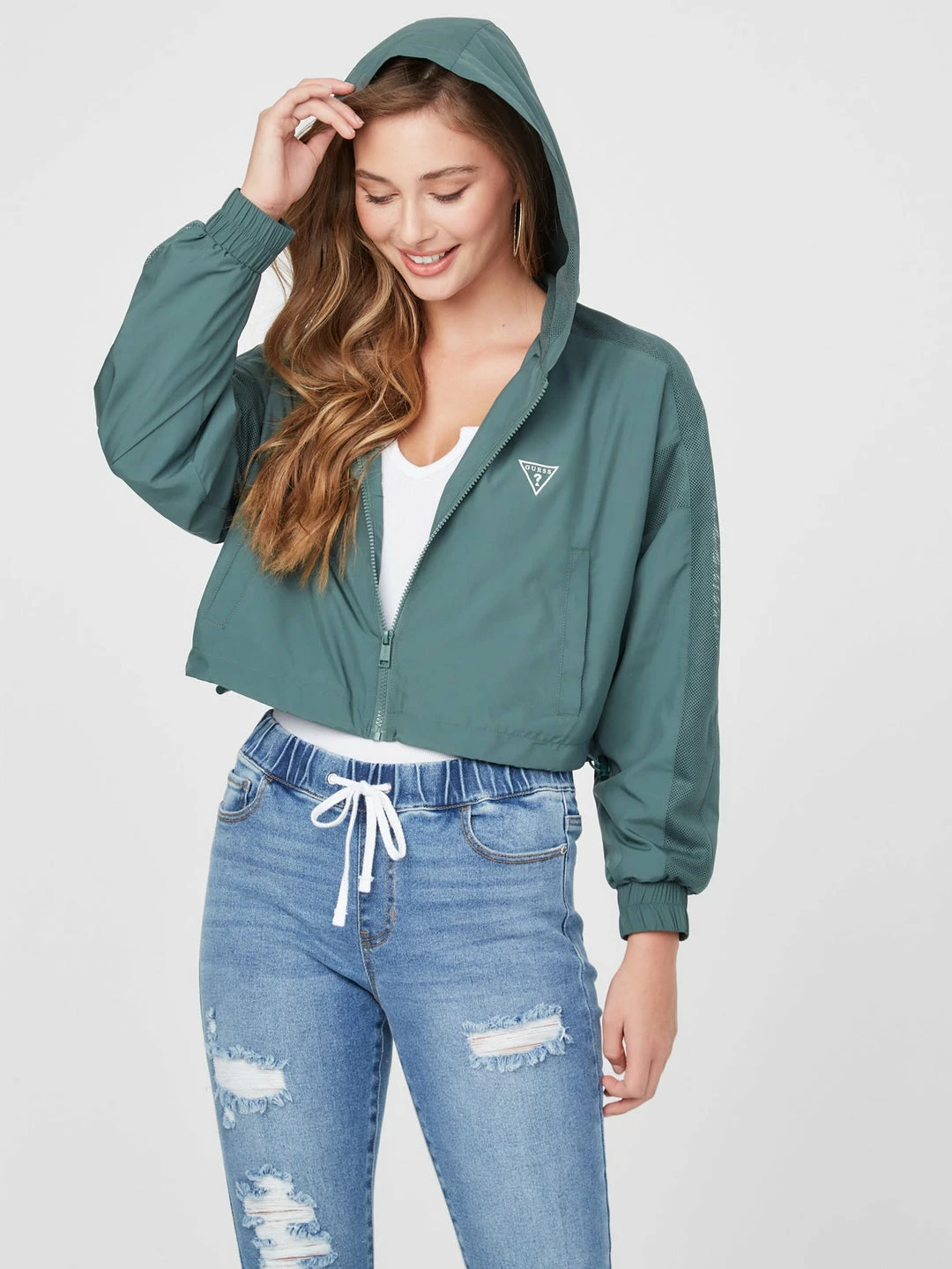 Get moving in this cropped nylon windbreaker featuring an attached hood, mesh piecing on the long sleeves and logo details at front and back. Side slip pockets and front zip closure.