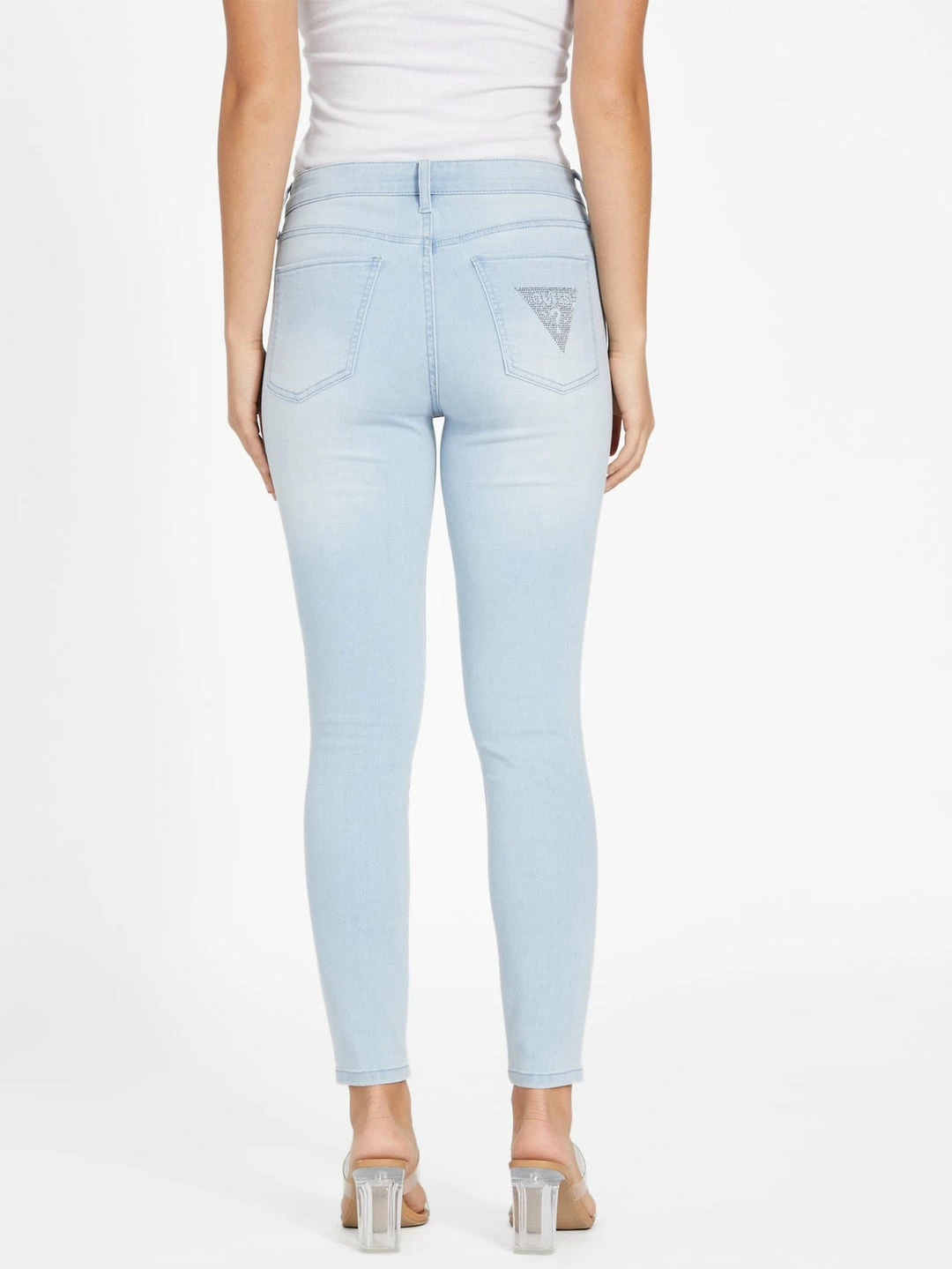 This pair of classic skinny jeans is designed with a mid-rise fit, five-pocket construction and features a rhinestone adorned logo detail at the back pocket. Contains recycled plastic.