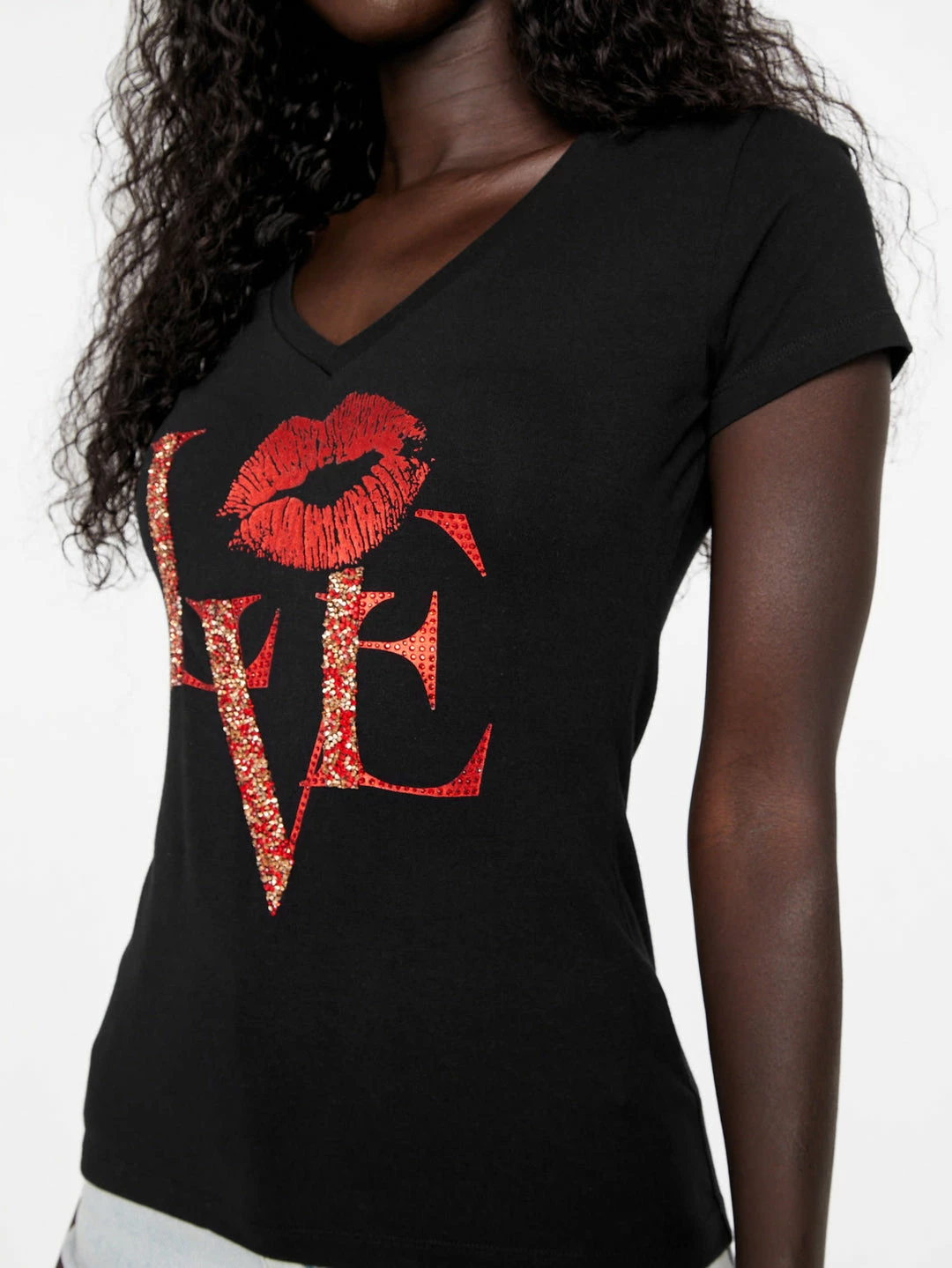 Fall in love with this short-sleeve tee featuring a V-neckline with lip graphic and text at front accented by rock crystal and rhinestone detailing. Uses organic cotton fiber.
