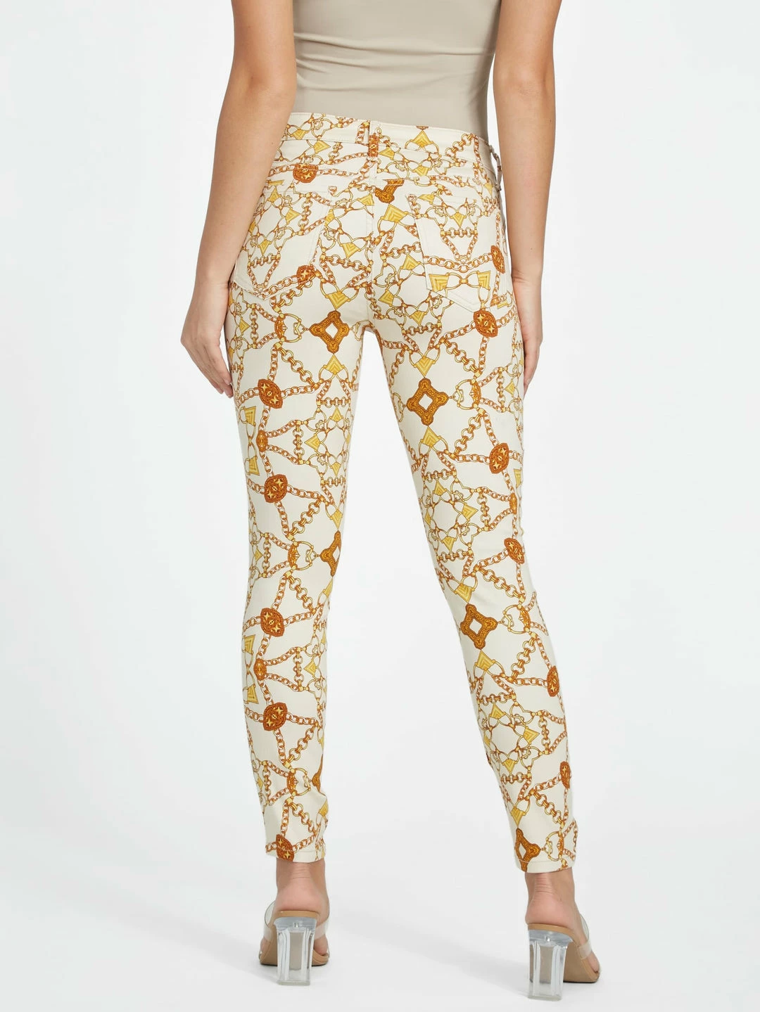 Elevate your look with these skinny jeans featured in an intricate allover chain print, with a mid-rise fit and five-pocket construction. Contains recycled plastic.