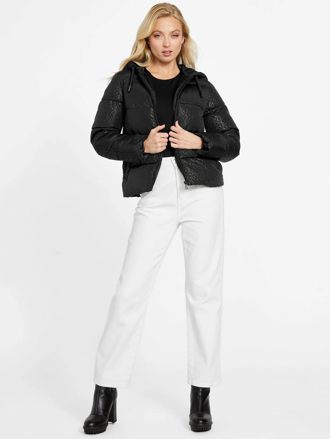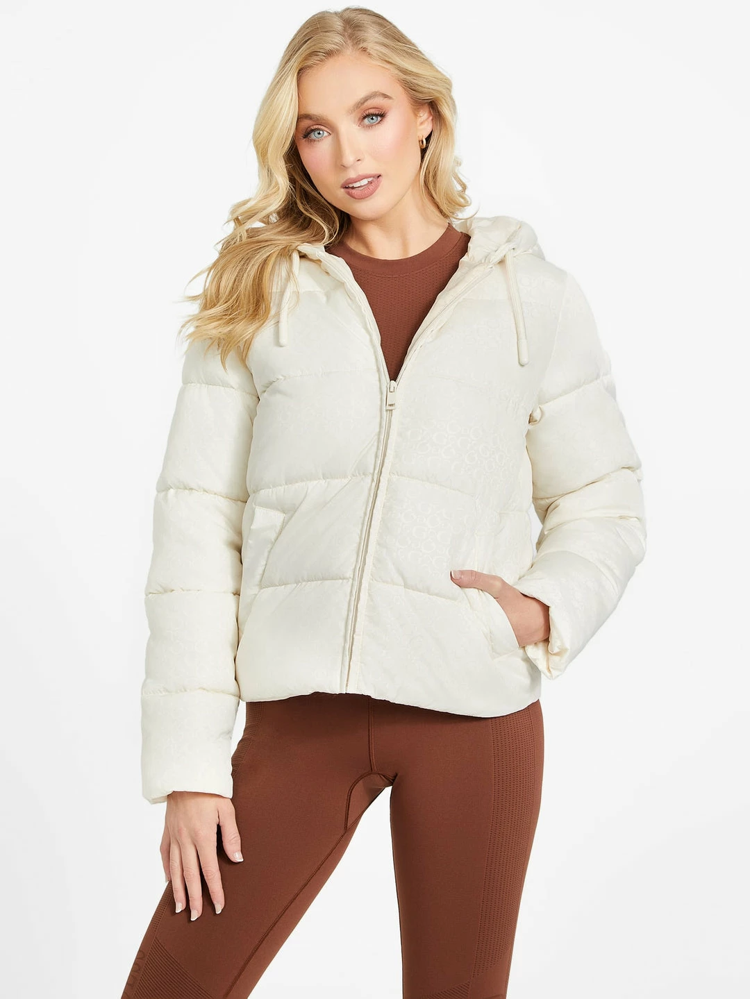 Essential for warm weather, this puffer jacket is a closet staple. Featuring a quilted fabrication, drawstring hood, minimalist allover logo print and front-zip closure. Contains recycled plastic.