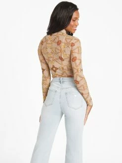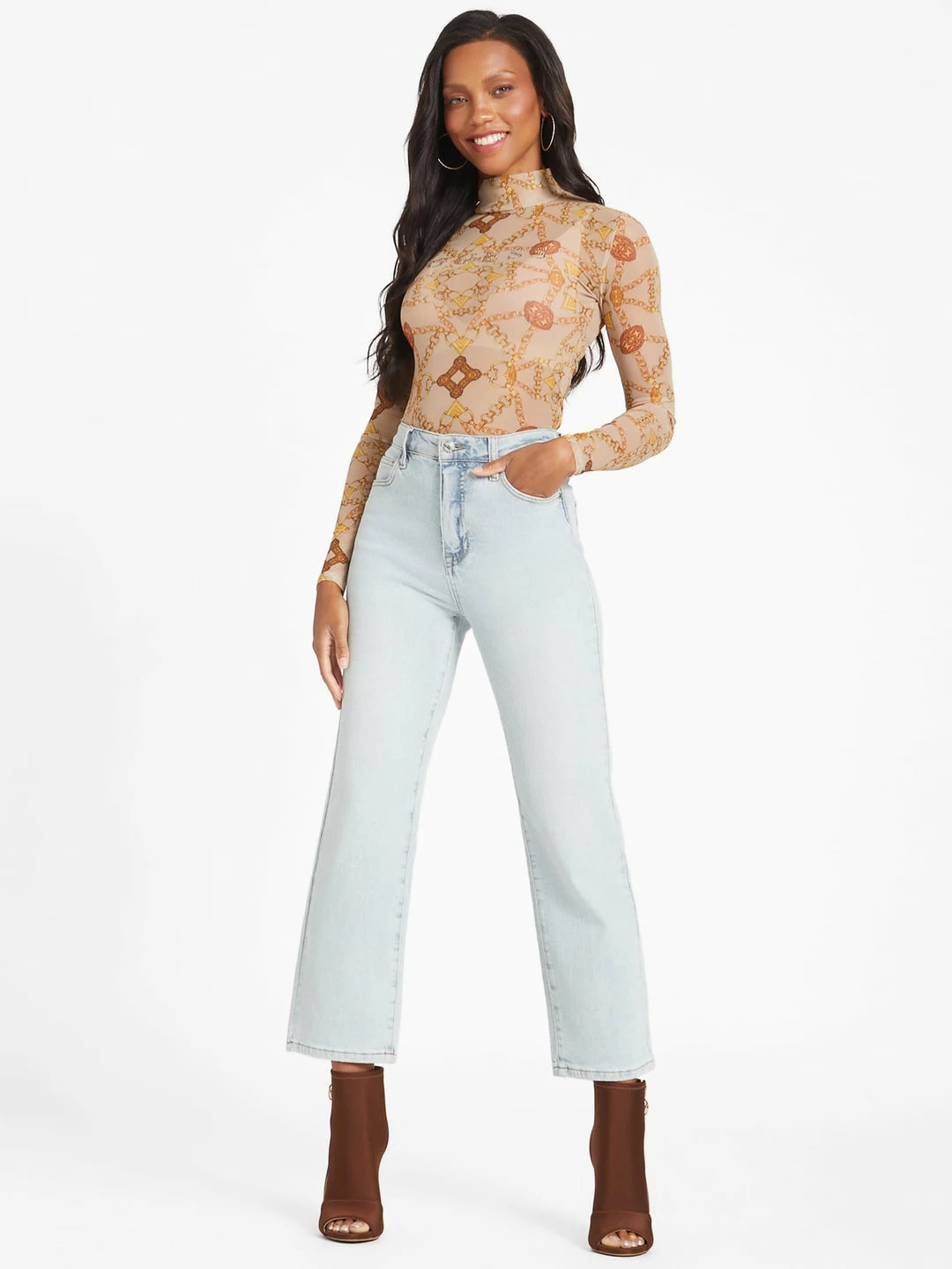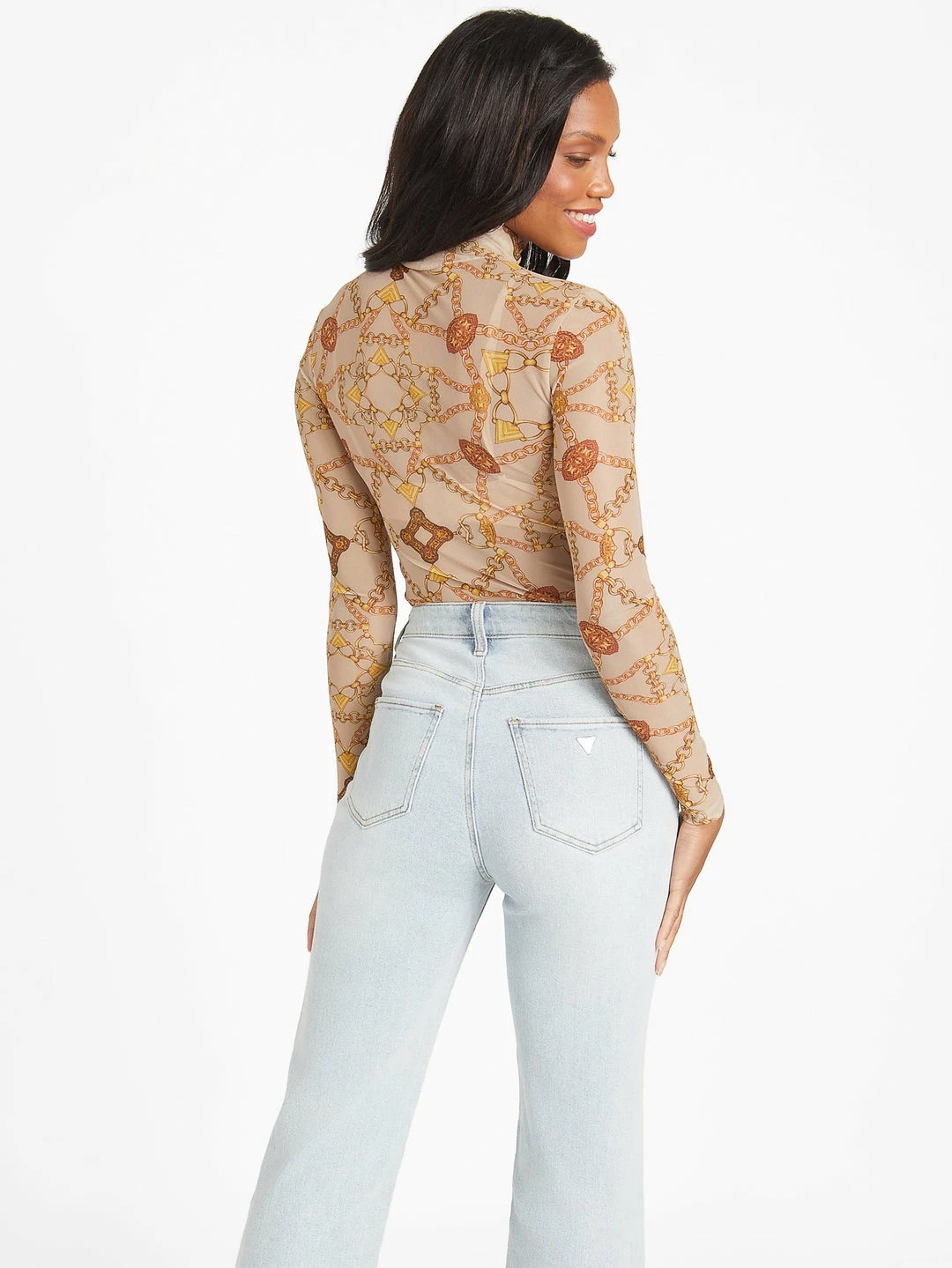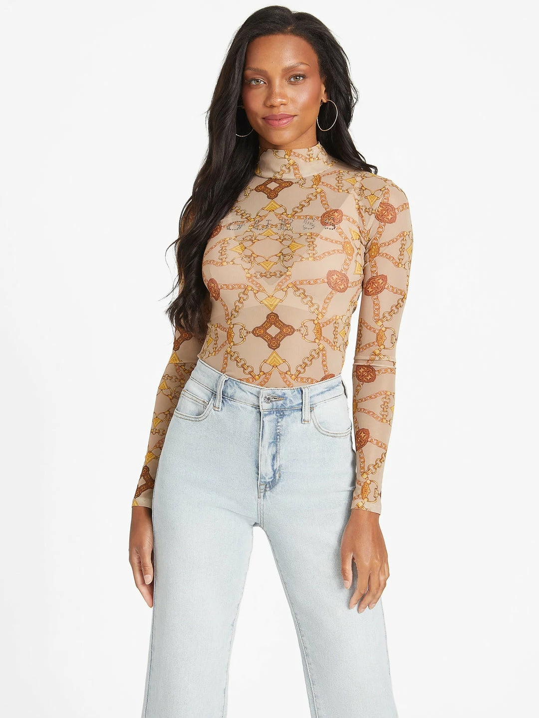 A semi-sheer mesh top featuring an allover chain-link print, turtle neckline, rhinestone logo and long sleeves. Made with recycled plastic.