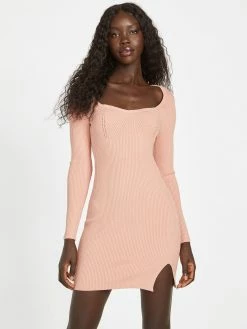For your next occasion, this knit sweater dress features an appealing portrait neckline and perforated detailing on the bodice. Completed by long sleeves and a slit in the skirt front. Made with biodegradable wood-based fibers.