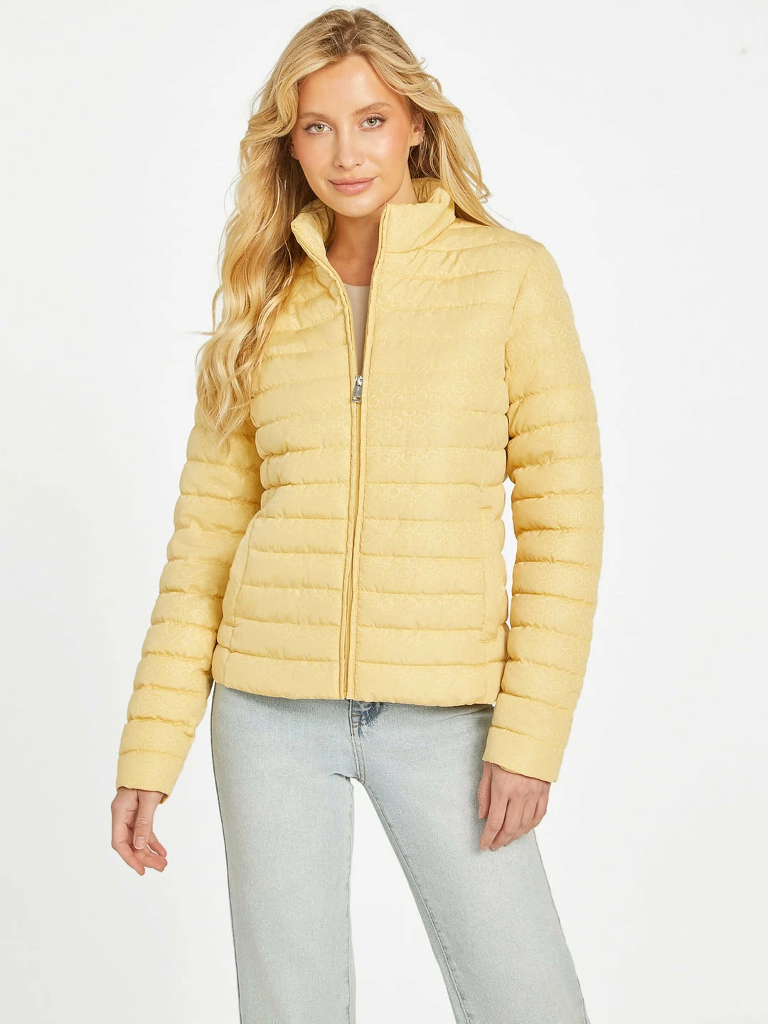 Beat the chill with this fitted quilted jacket featuring an allover subtle logo print. Designed with a stand collar, side slip pockets and front zip closure. Made with recycled plastic.