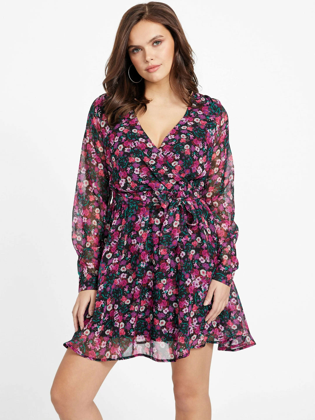 Ready for your next event, this pretty chiffon dress is designed in an allover print and features a surplice V-neckline, long sleeves and ribbon belt at the empire waist. Contains recycled plastic.