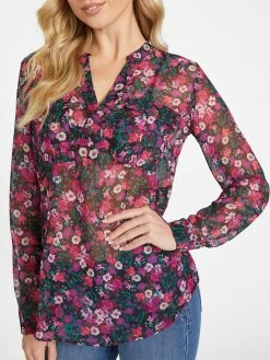 Top off your look with this long-sleeve style crafted in a sheer material featuring an allover print. Designed with a band collar with V-slit detail and dual chest pockets. Contains recycled plastic.
