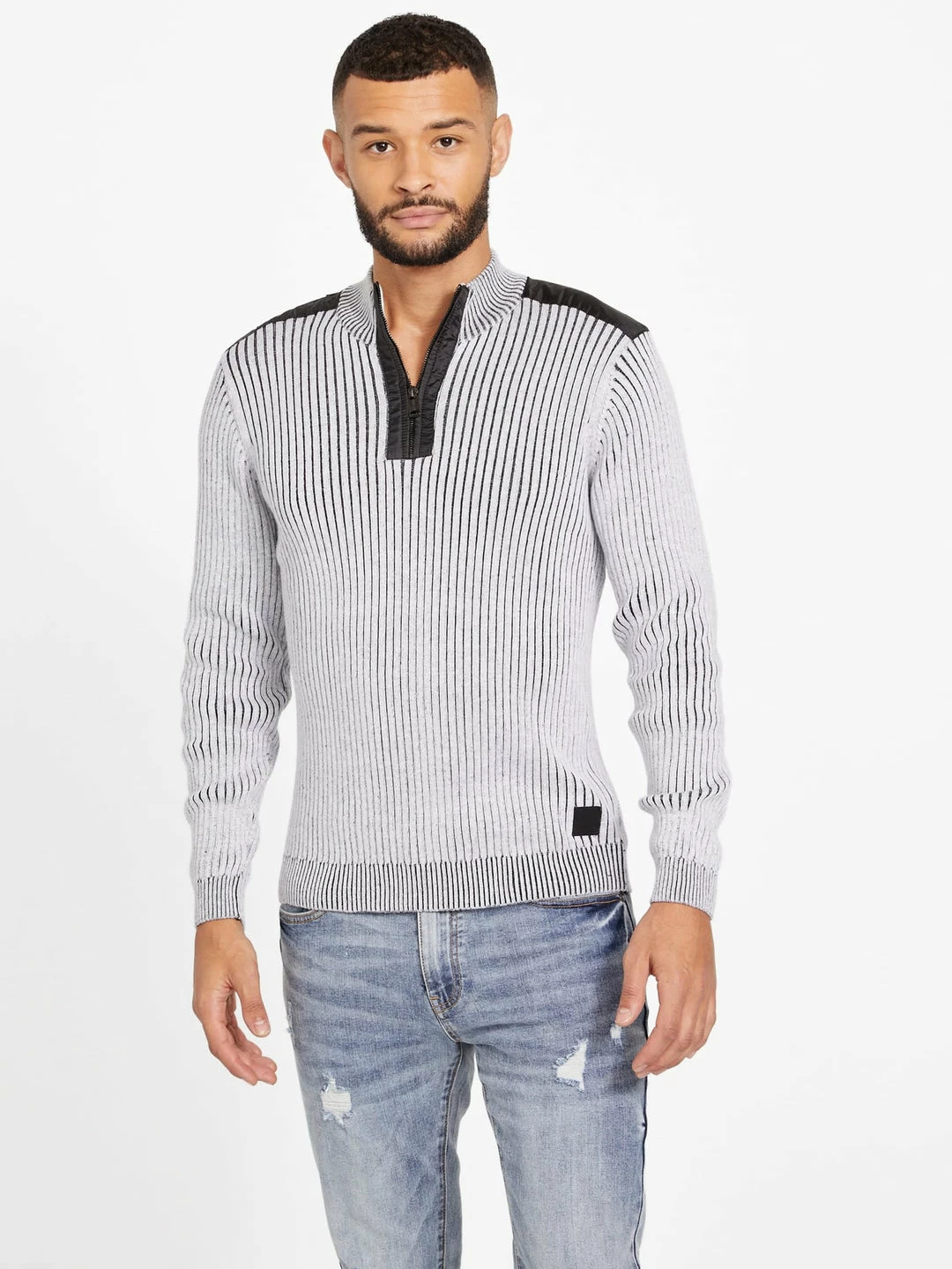 Level up with this zip sweater. Featuring an allover vertical stripe, mock neck with zip, stripe on shoulders, ribbed trim and logo patch. Made with organic cotton fiber.