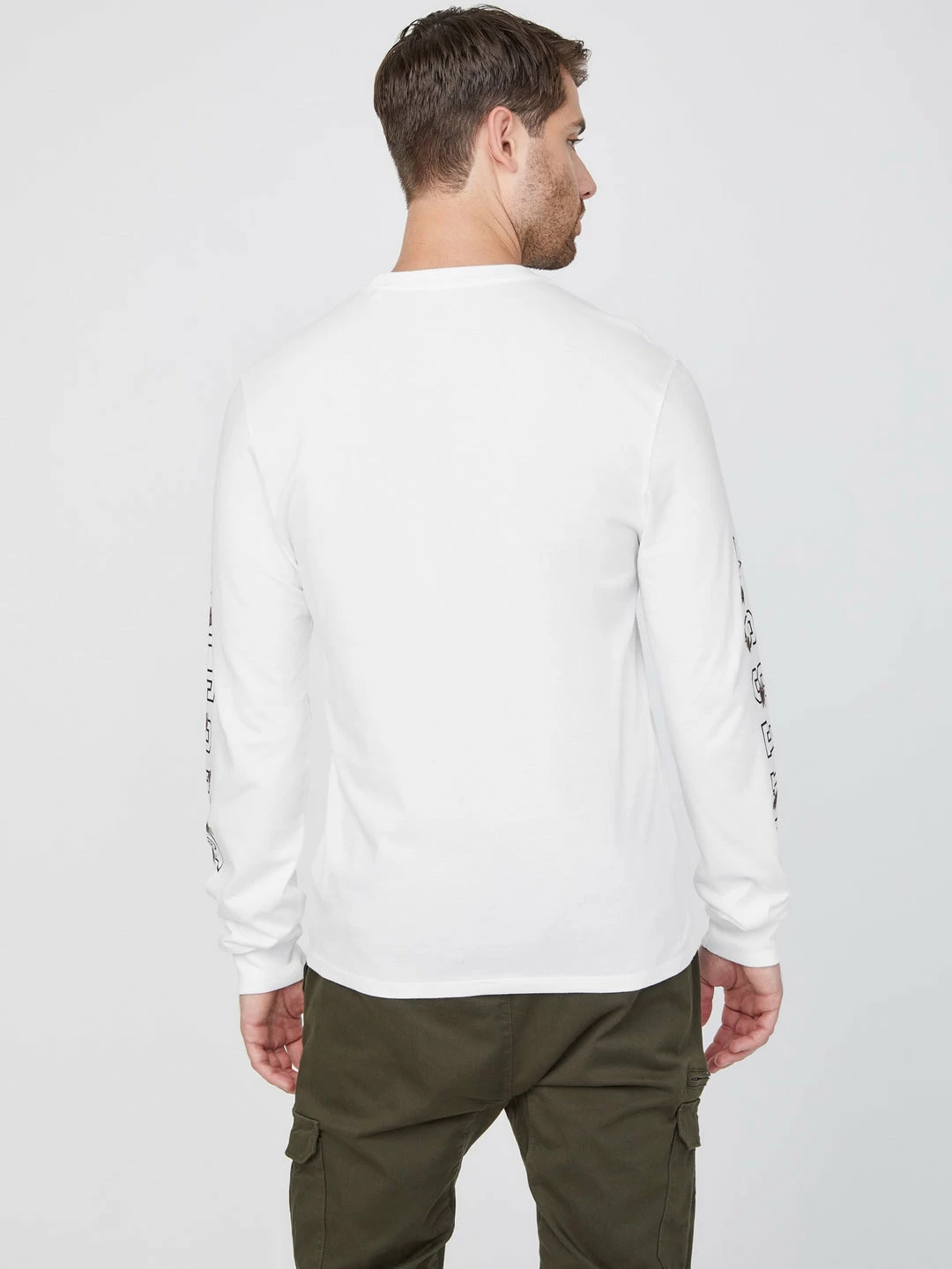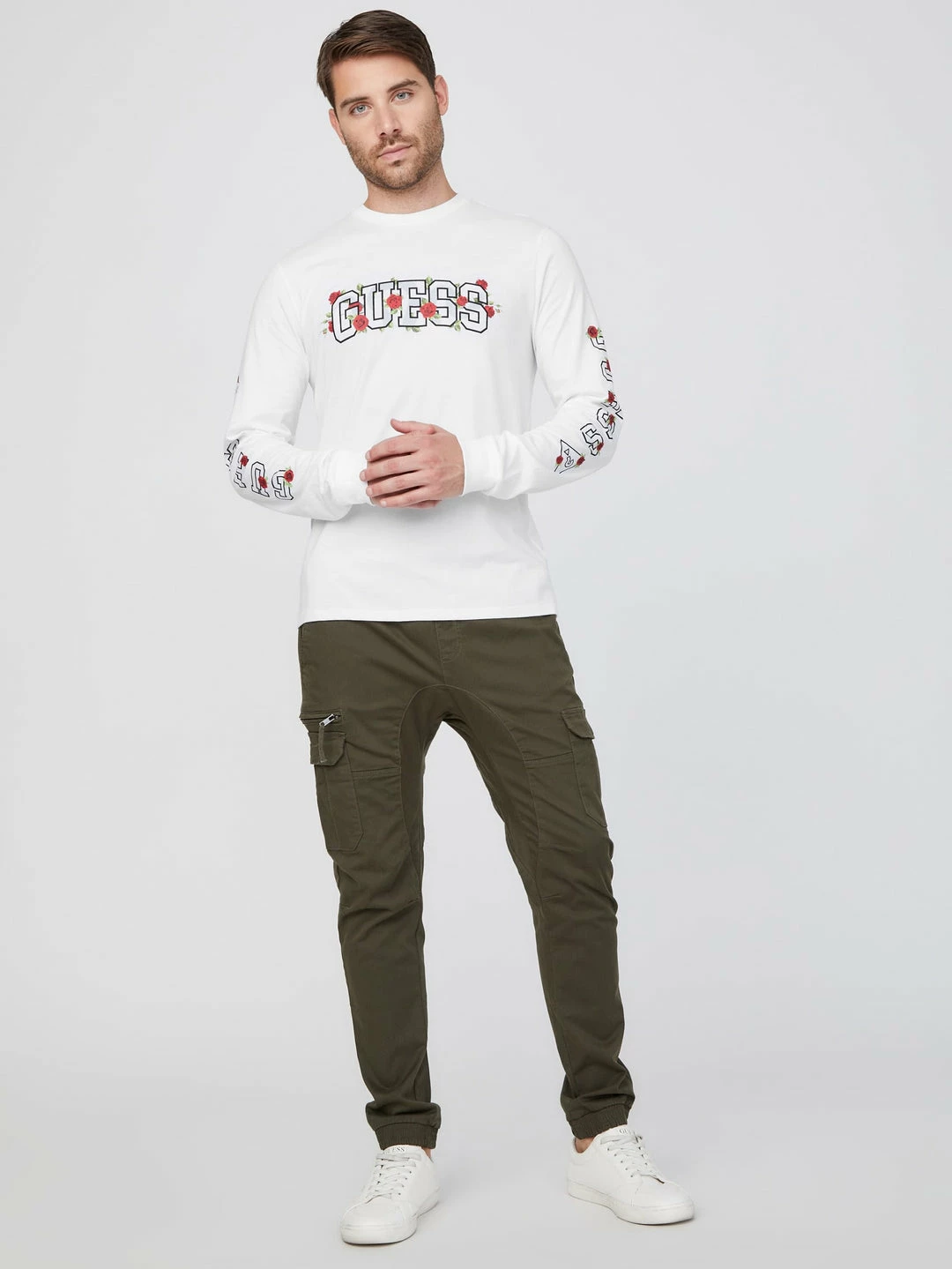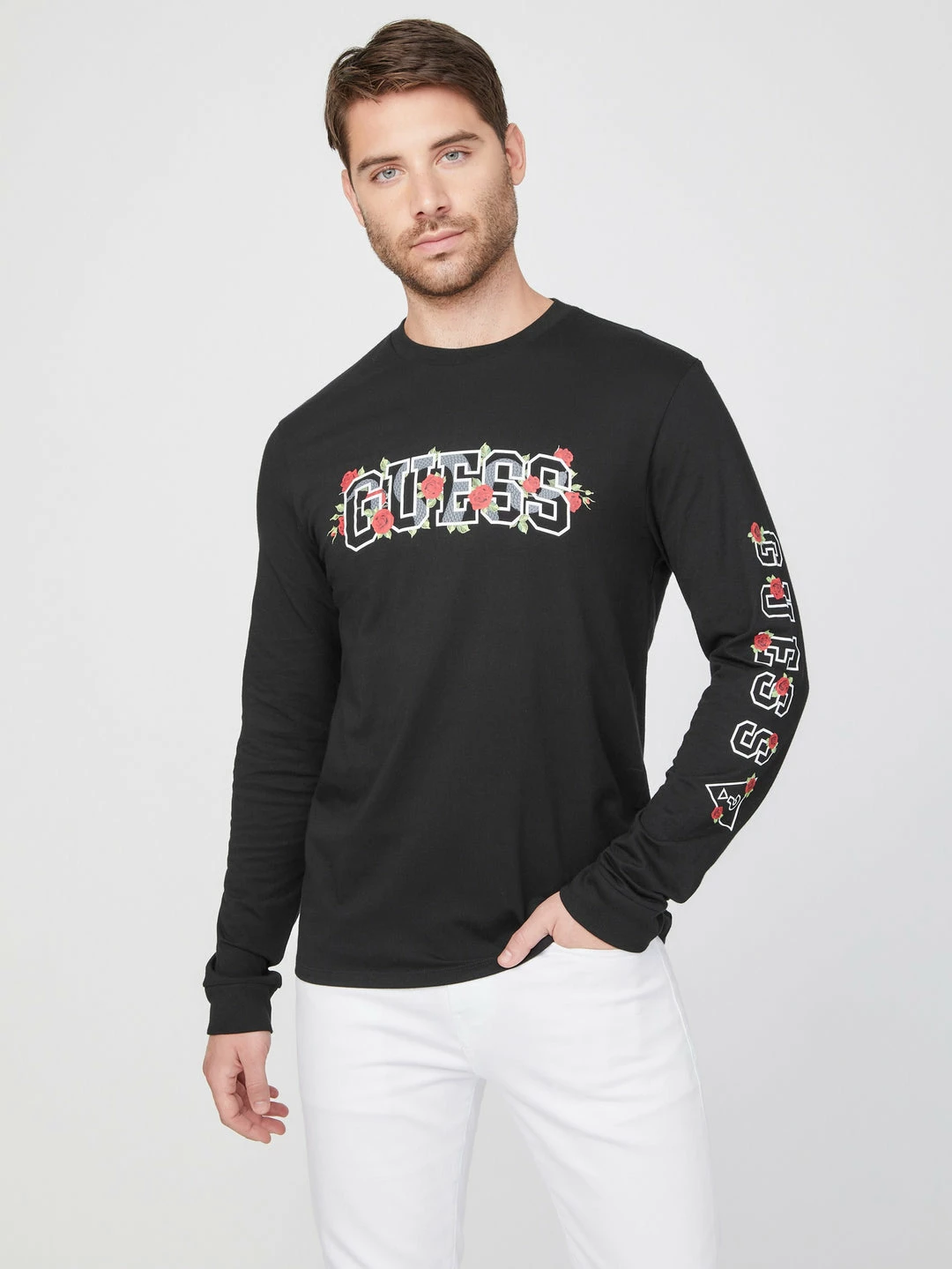 Casual crewneck pullover featuring rose-detailed logo graphics at front and down the long sleeves. Made with organic cotton fiber.