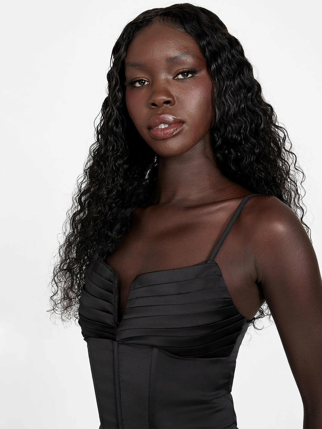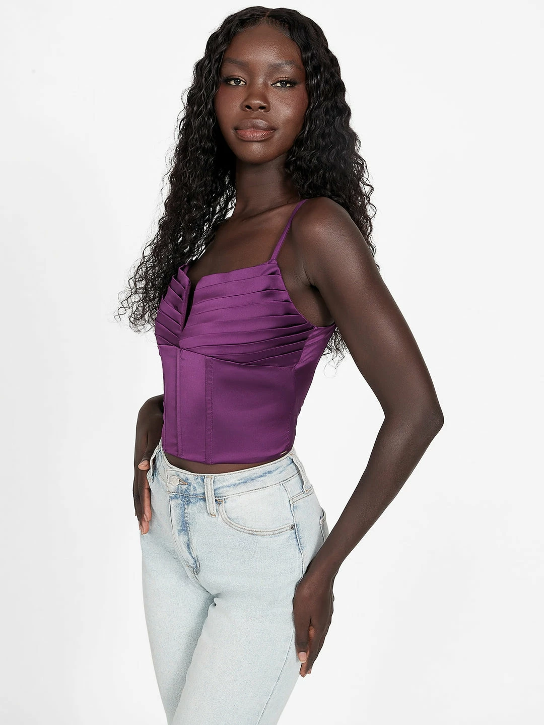 Stun the room in this satin top. Designed with a corset constuction, thin straps and pleated split neckline. Contains recycled plastic.