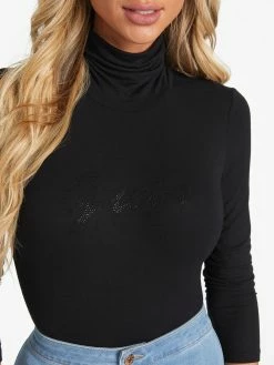 For your love of logo, a knit top featuring a turtle neckline, rhinestone signature logo and long sleeves. Responsibly sourced forest fiber.